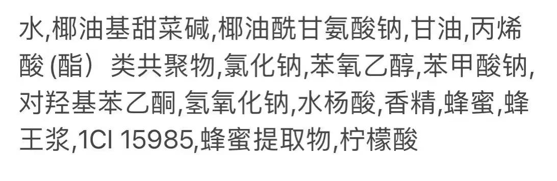 再看看成分,清洁主体是氨基酸表活,椰油酰甘氨酸钠,复配甜菜碱表活,椰油基甜菜碱,有香精色素的添加,低刺激的苯氧乙醇,苯甲酸钠,构成了防腐体系,添加了水杨酸,在洁面产品中并无太大作用。整个配方看,17种成分组合,成分简单,清洁主体还算温和,清洁力还可。