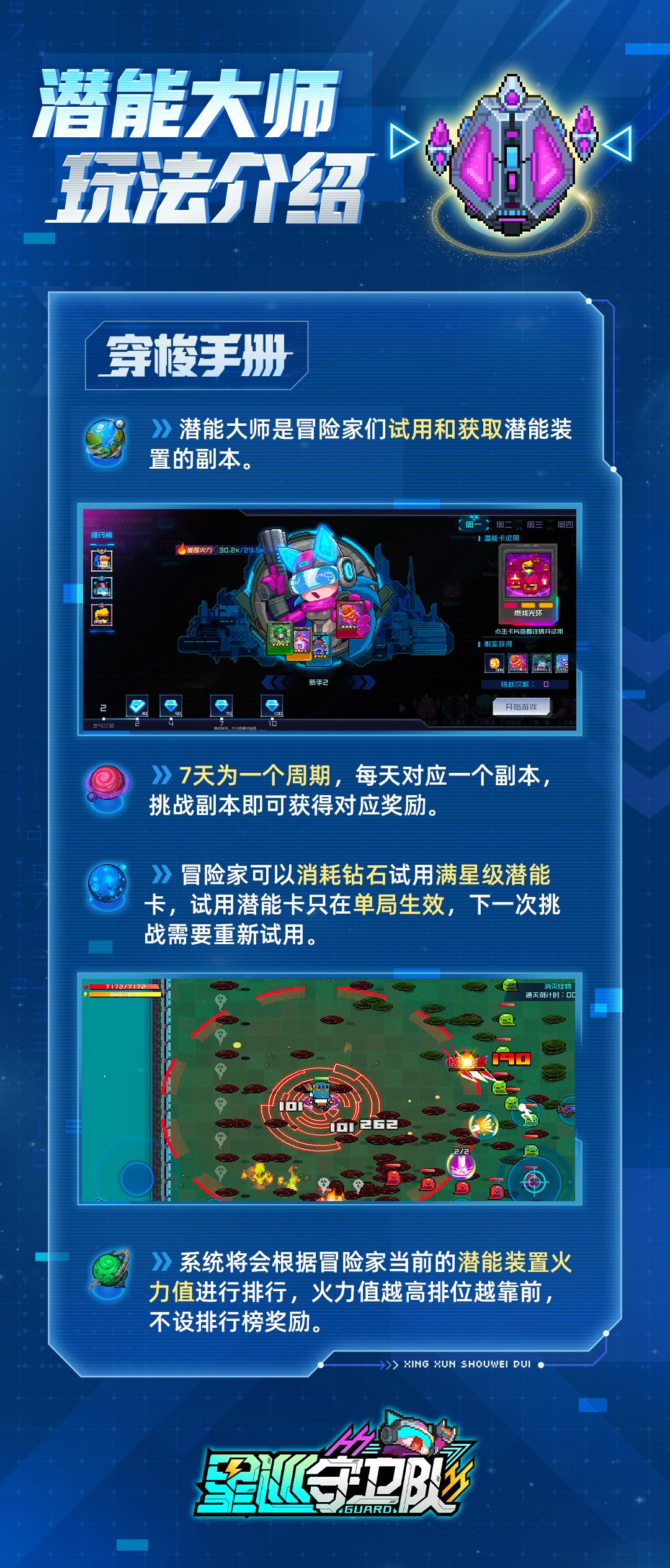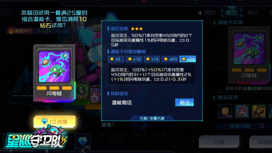 ❏ 试用潜能:试用一套满25星组合潜能卡,利用强大的潜能装置清剿四周的威胁!