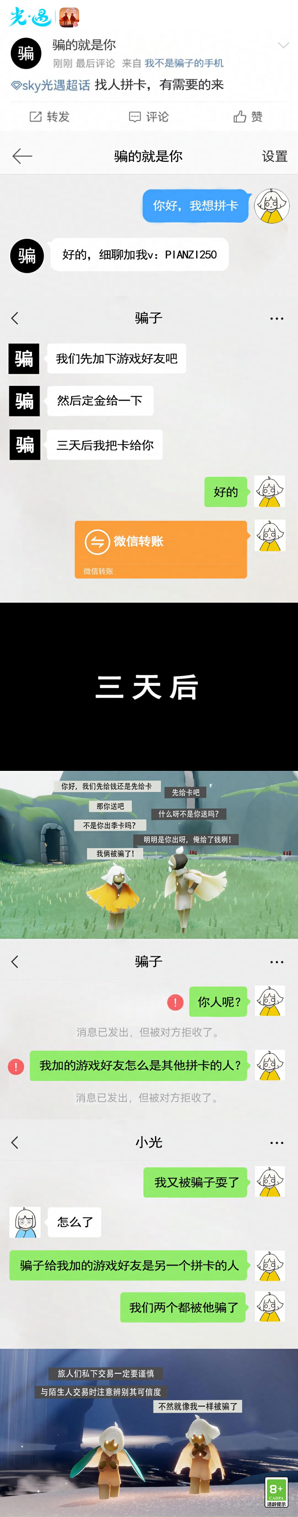 此外,我们针对近期天空王国中出现的拼卡骗局的现象准备了一期防骗分享,希望旅人们甄别诈骗行为,避免造成自身损失。