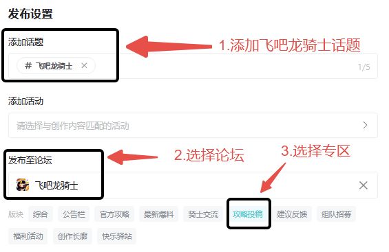 只要在TapTap飞吧龙骑士论坛发布你的攻略,带上#飞吧龙骑士 话题,并选择攻略投稿子版块,即算作成功投稿!