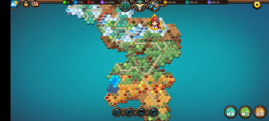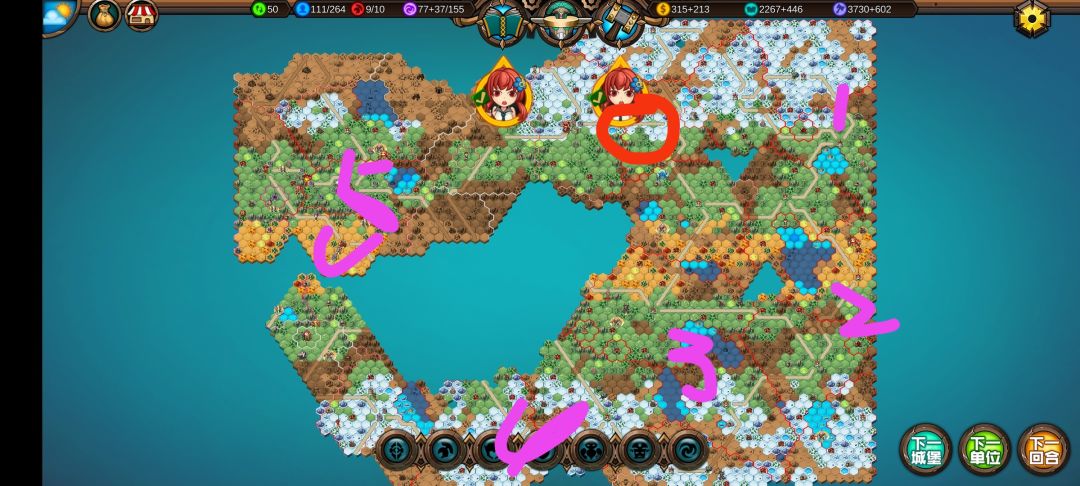 然后关键的来了,在20回合前至少要探5-7个图,打下4-5个地(10回合开始就开始探地打城,女海盗可带一个兵单走,机械龙带召唤师,召唤师主要是K头叠被动🌝🌝🌝)