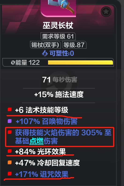 然后这里两个点说一下,如果火魔灵打持续伤害点燃,可以考虑同构武装,然后配合长杖的词条:获得技能火焰伤害的 305% 至基础点燃伤害