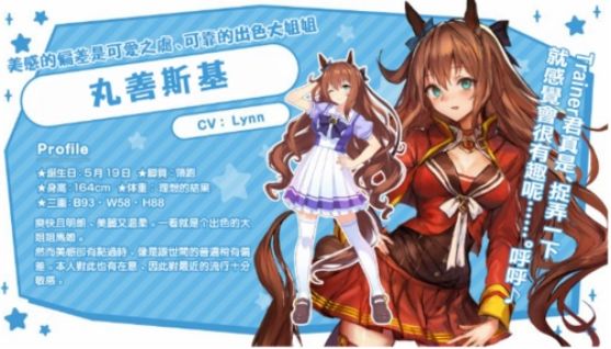 丸善斯基有着深厚的背景,她出身于名门马娘之家,才貌双全,性格开朗,是美貌与实力并存的一个角色,因此在游戏当中大受玩家们的欢迎,并且这个人物也是有历史原型的,在历史上,就在赛马比赛当中取得过不俗的成绩,在1978年这位战绩辉煌的赛马名将退役。