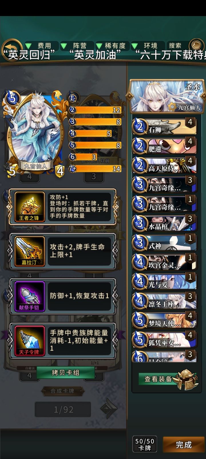 这套九宫仙人亚瑟主要以仙人铺场压场为主,雷神后续补伤害斩杀,加上后期饥荒打卡牌差压制对手获取胜利。
