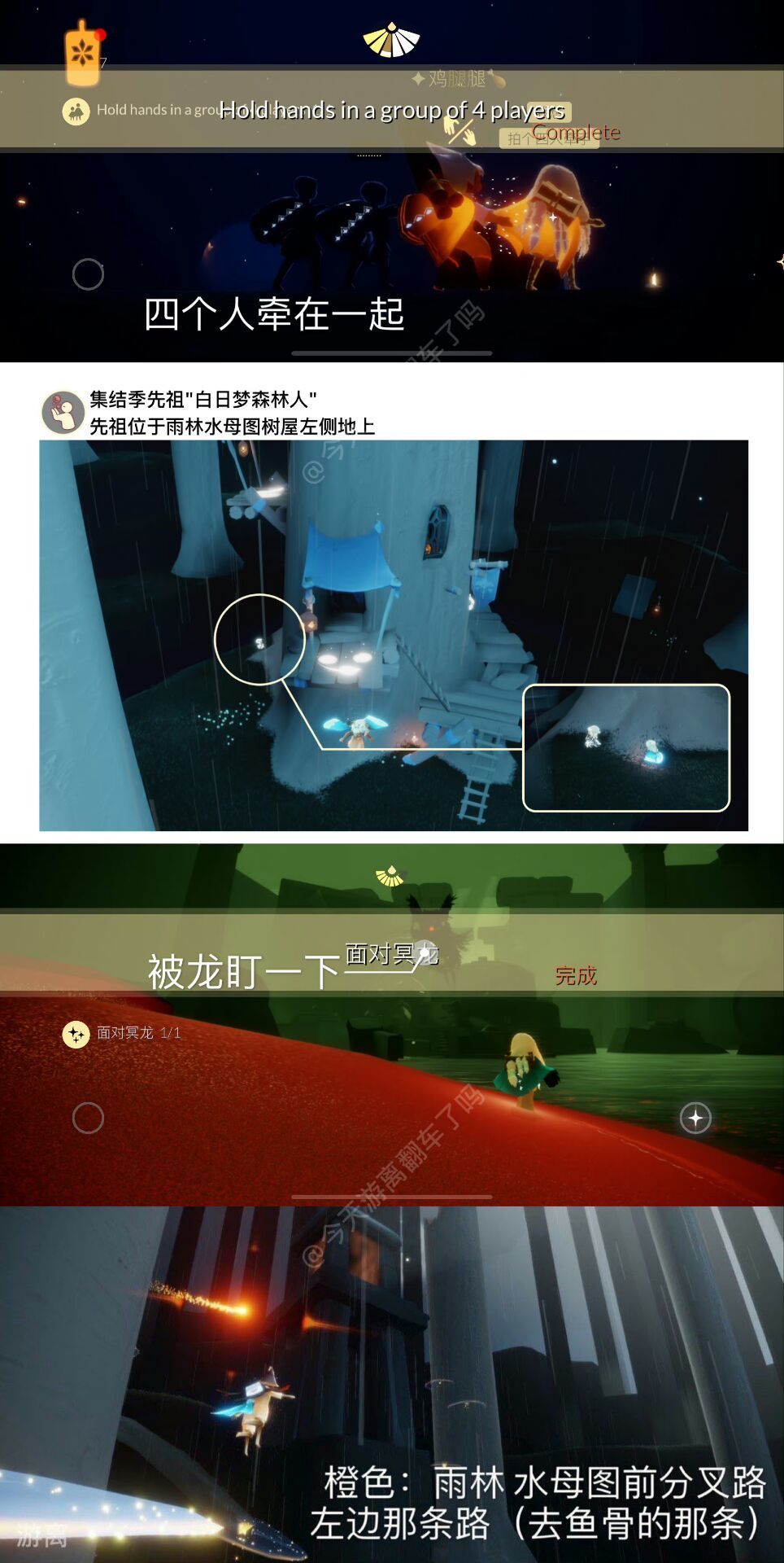 「四人牵手组队」四个人牵在一起,也可通过在【霞谷表演季剧场右边洞口的火盆旁】或【禁阁庇护所向导对面方罐子旁】打坐重温对应季节任务完成。