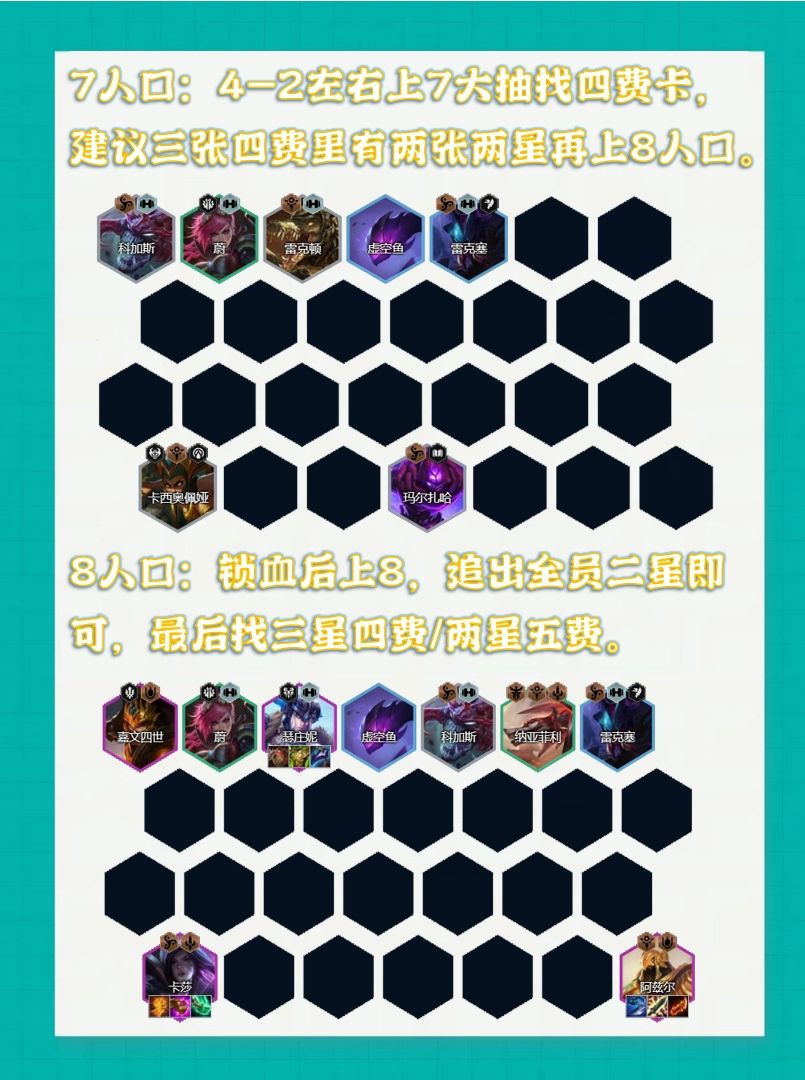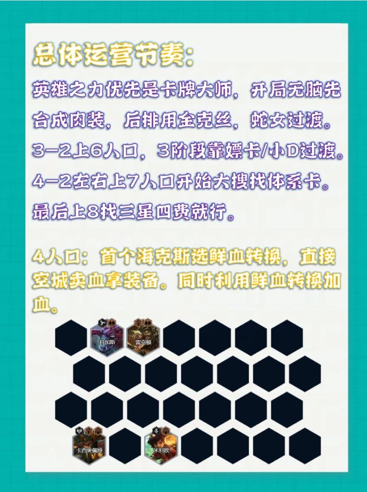 阵容可以7人口D牌,8人口再上皇子就行。但是前期依旧是需要保留血量(个人理解是当前版本难打连败,尤其是没有鲜血转换的情况下)。英雄之力优先是卡牌大师,开局无脑先合成肉装(能轻松辅助打出连胜),后排有金克丝就金克丝(出攻速装备),用蛇女过渡也行。3-2上6人口,3阶段靠嫖卡/小D过渡。4-2左右上7人口开始大搜找体系卡。现在强势的打气月男还有铁男都是7人口就差不多成型,所以我自己的建议是三个核心里起码两个两星了再上人口。最后上8找三星四费就行。