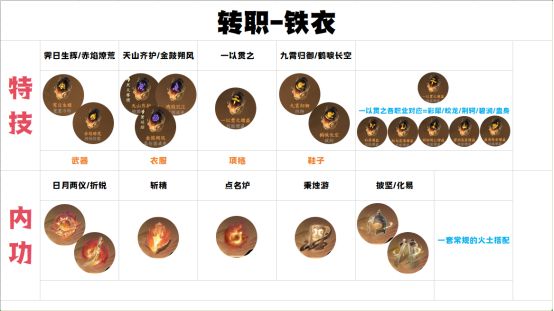 想要转职铁衣的少侠,我们可以准备【霁日生辉/防御特技/一以贯之/九霄归御】外加一套能抗能打的火土内功周天就可以了。铁衣作为一个坦克职业需要为队伍抗伤,所以优先需要考虑自身坦度,然后再提升输出避免OT乱仇。