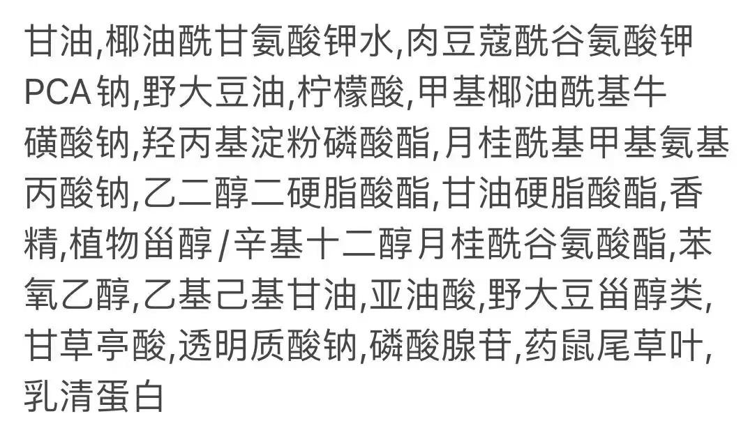 再看看成分,清洁主体是氨基酸表活,椰油酰甘氨酸钾,复配了肉豆蔻酰谷氨酸钾等三种氨基酸表活,无色素,有香精的添加,低刺激的苯氧乙醇构成了防腐体系。至于添加的柠檬酸,单个成分拿出来看有去角质的作用,实际在洗去类产品中,作用有限。