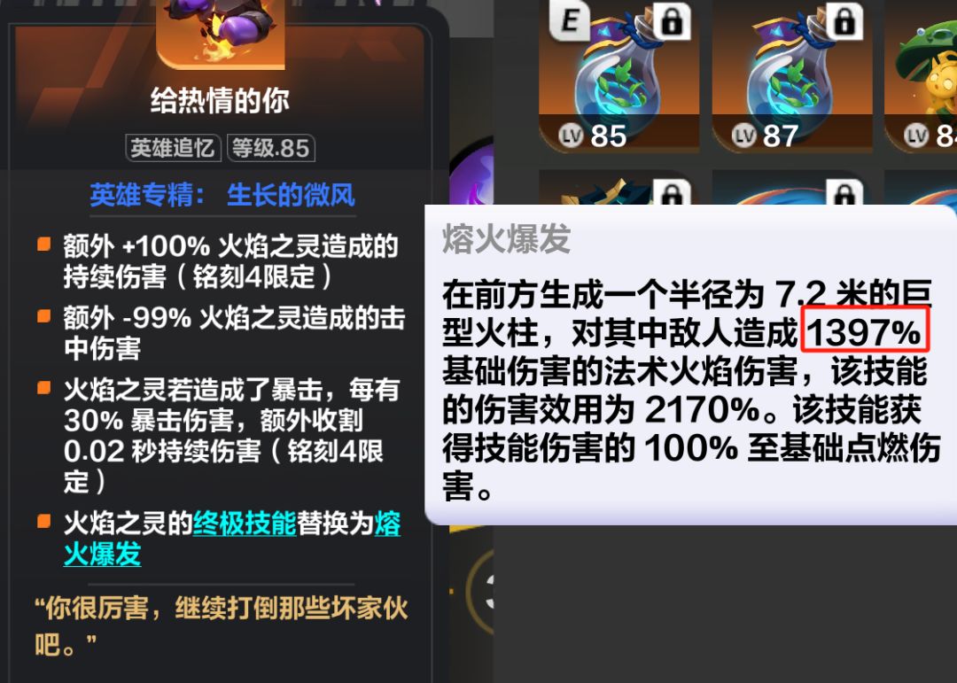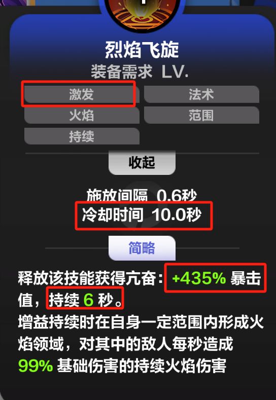 关于火魔灵的技能这里在提一点,那就是烈焰飞旋可以加大量暴击值。这玩意虽然标了是一个激发技能,但是吃不吃激发技能效果加成这个词条我也不知道
