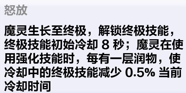 火魔灵是可以一直保持怒放状态的,如果 累计获取25层润物的时间<怒放的持续时间,那么魔灵就能一直处于终极状态,如果魔灵终极技能的冷却时间足够短,那么就能非常频繁的释放终极技能,不用多说伤害爆炸