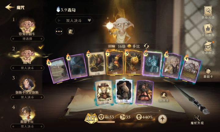 伙伴卡的使用:一号位可用邓布利多、小赫敏、高等级凯文;二号位可用邓布利多、麦格、罗恩;三号位可用多比、海格、哈利。