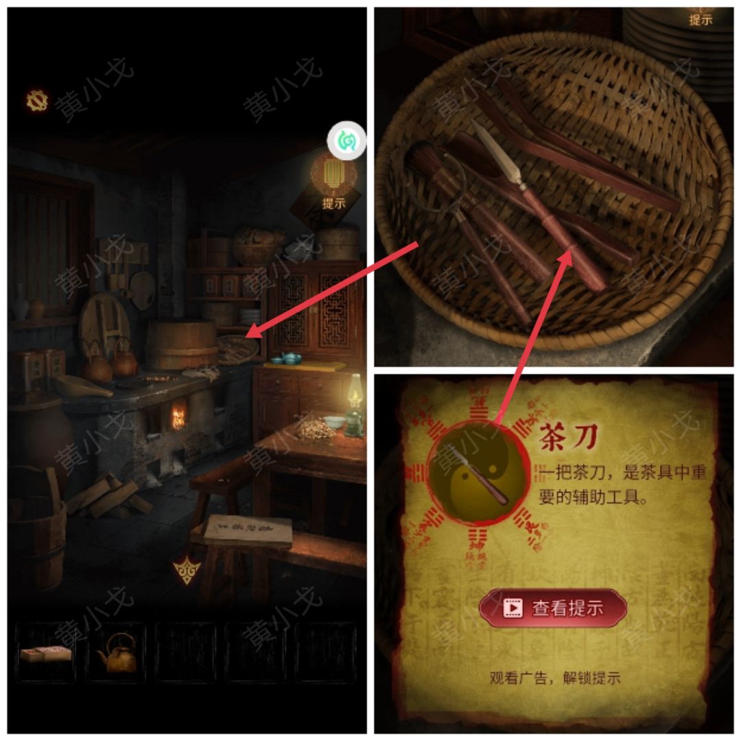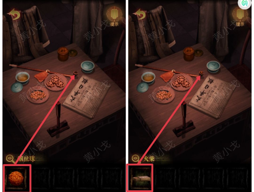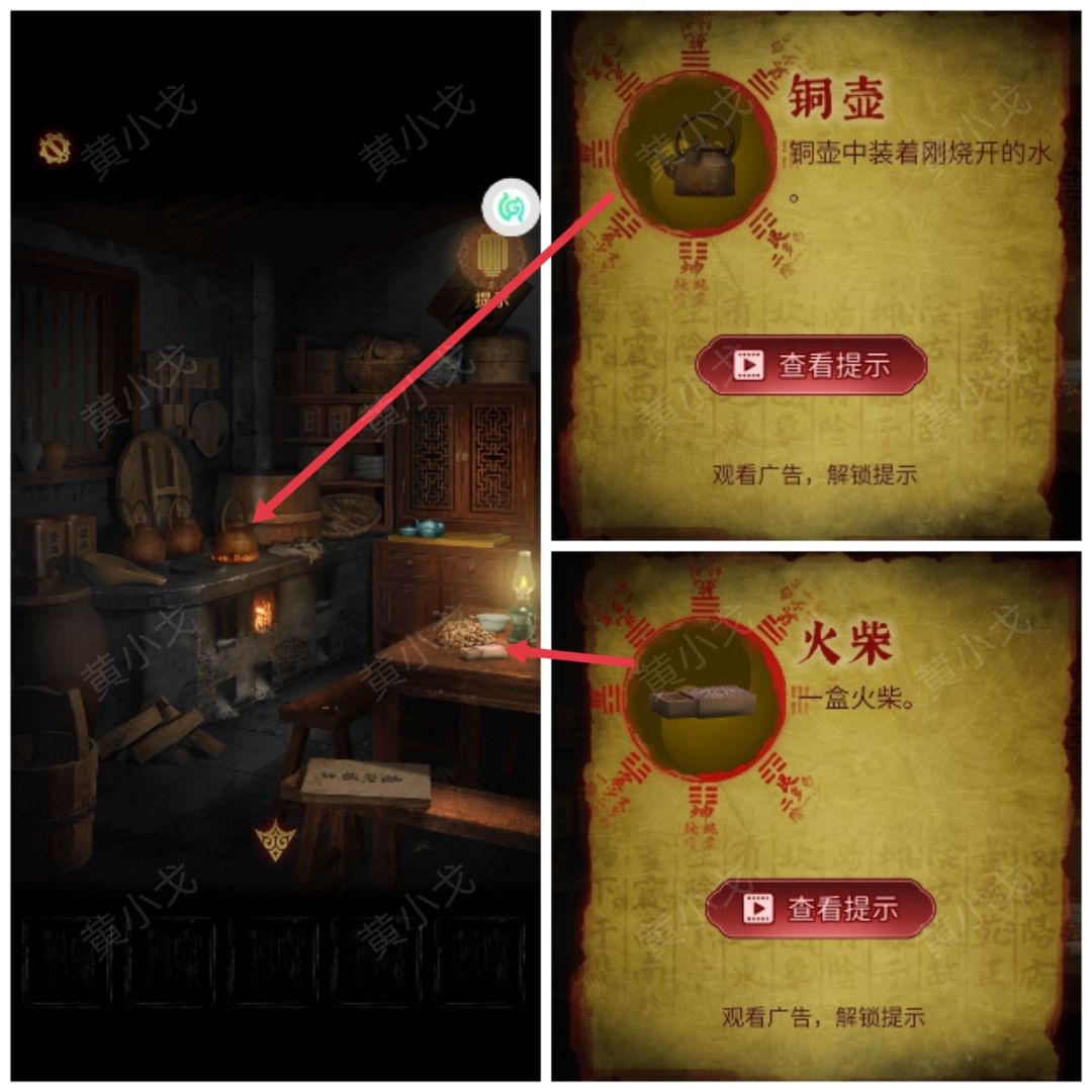 9.点击获取桌子上的【火柴】,灶台上的【铜壶】