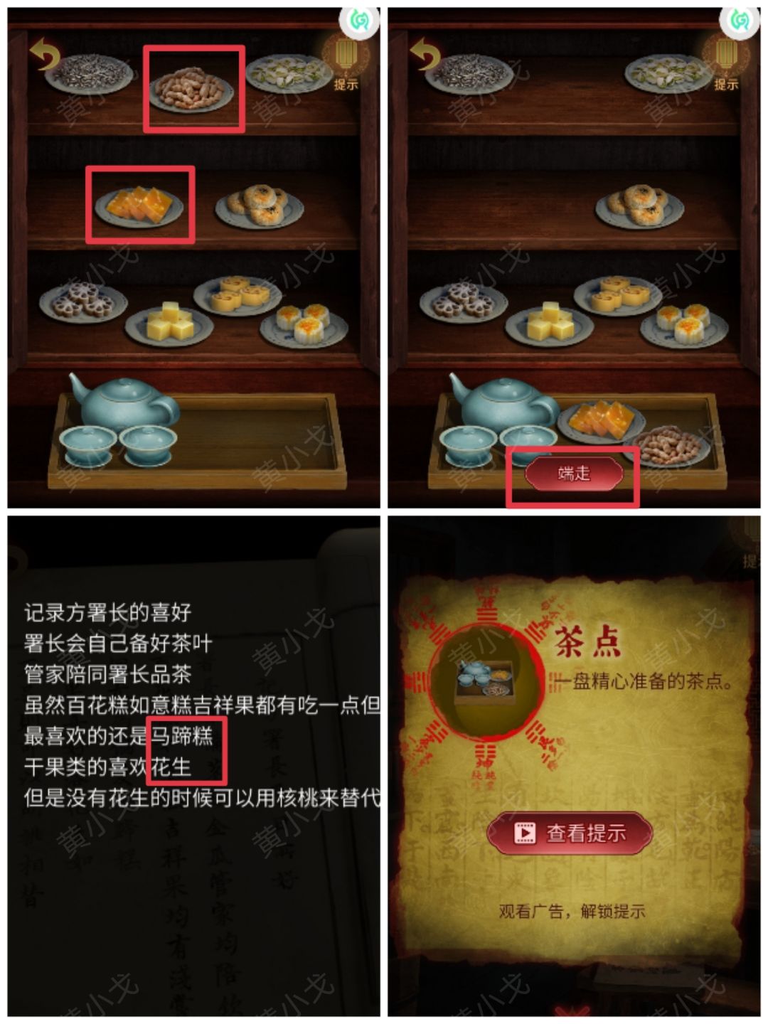 13.打开点心柜子,根据客人喜好记录本上记录的方署长的喜好,选择点心(马蹄糕,花生),获得【茶点】