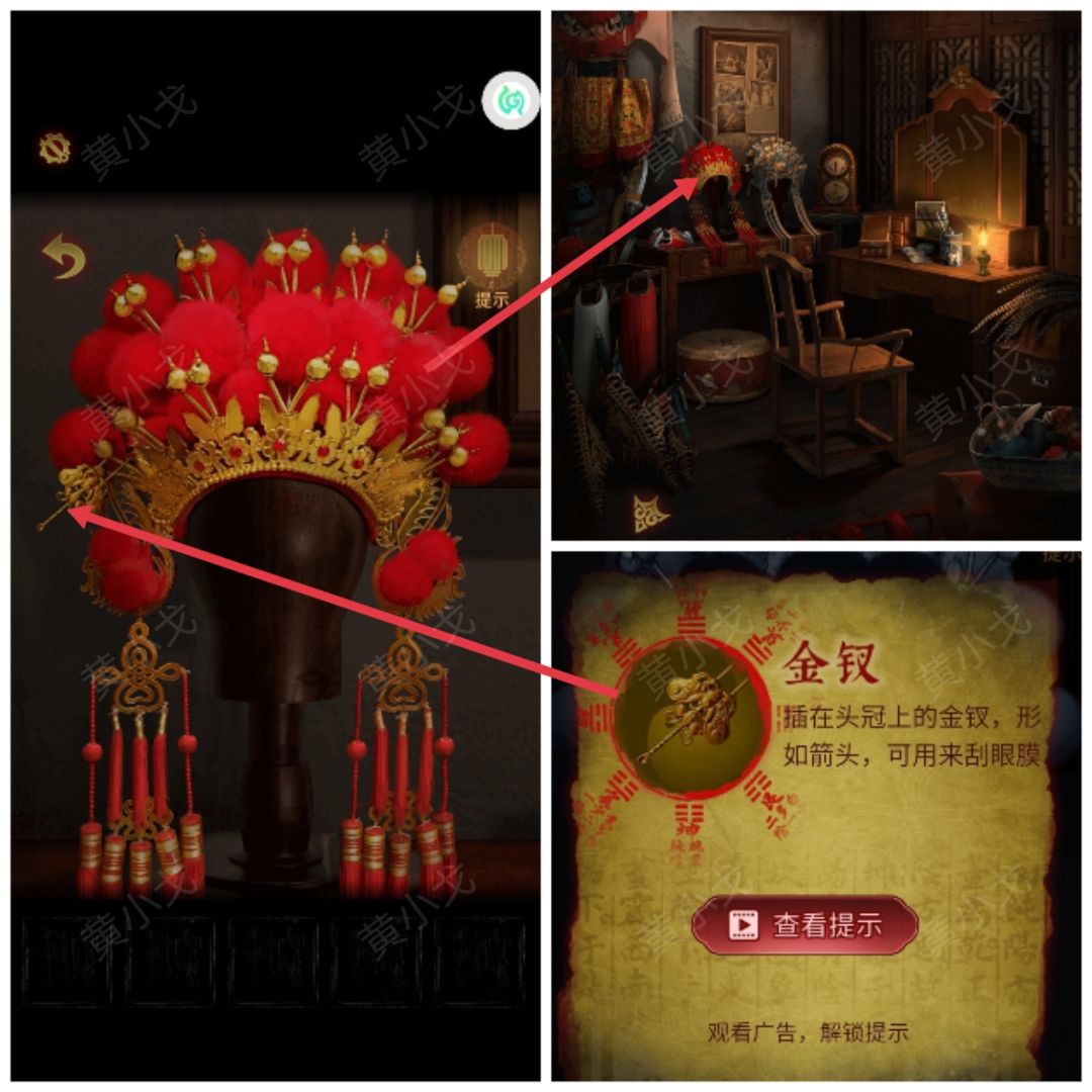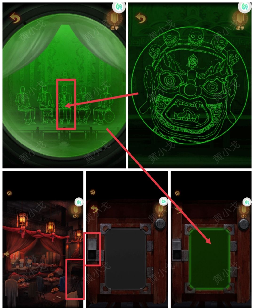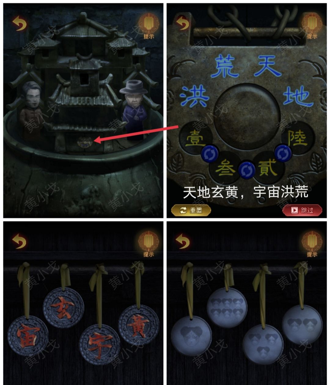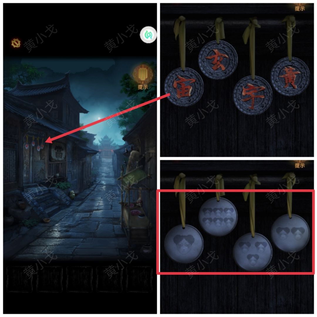 4.点击门上挂着的铜牌,翻开铜牌,获得线索(娃娃头数量及对应的字:宙-1、玄-6、宇-3、黄-2)(小高能?)