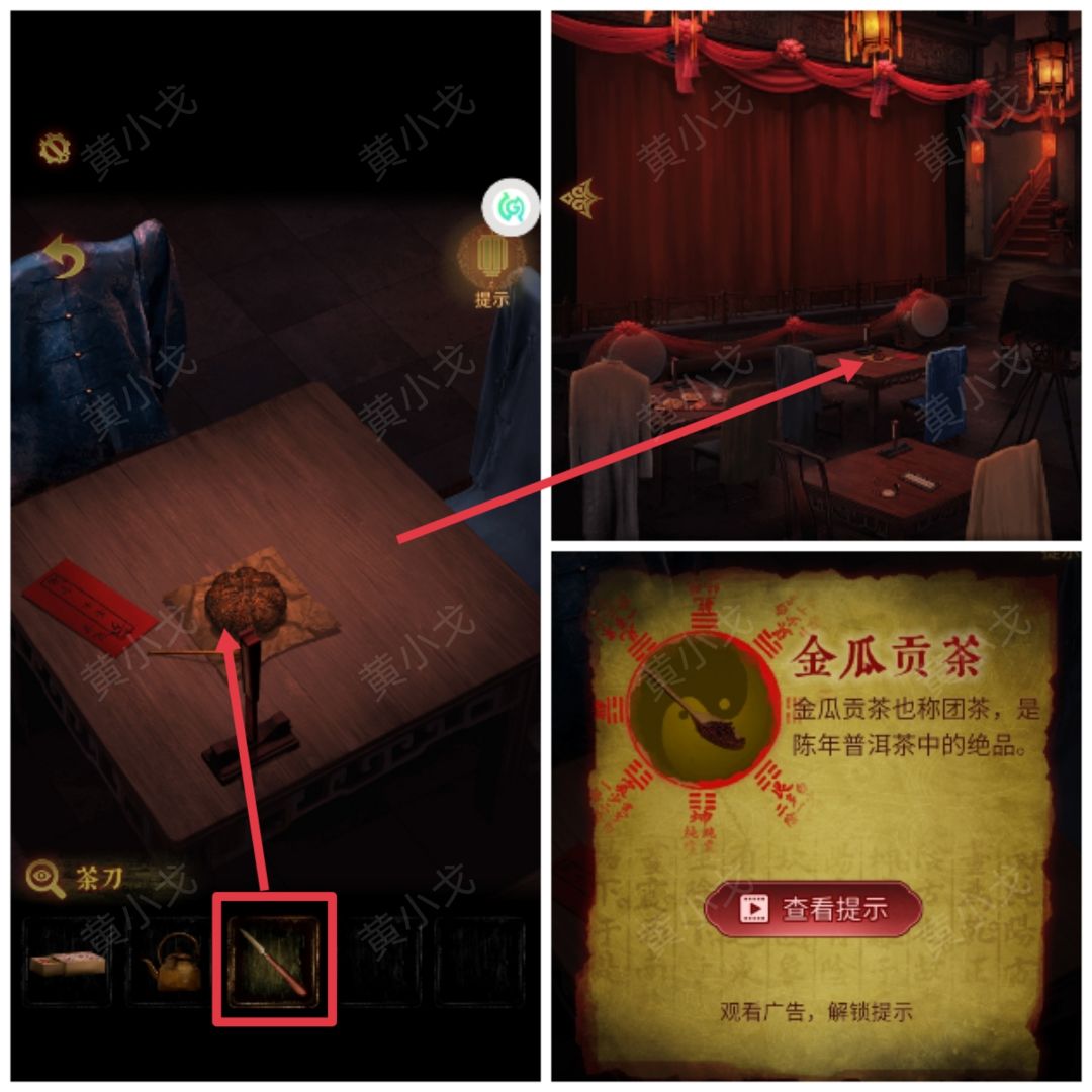 11.(戏楼-看台)点击右边的桌子,用【茶刀】刮茶叶,获得【金瓜贡茶】