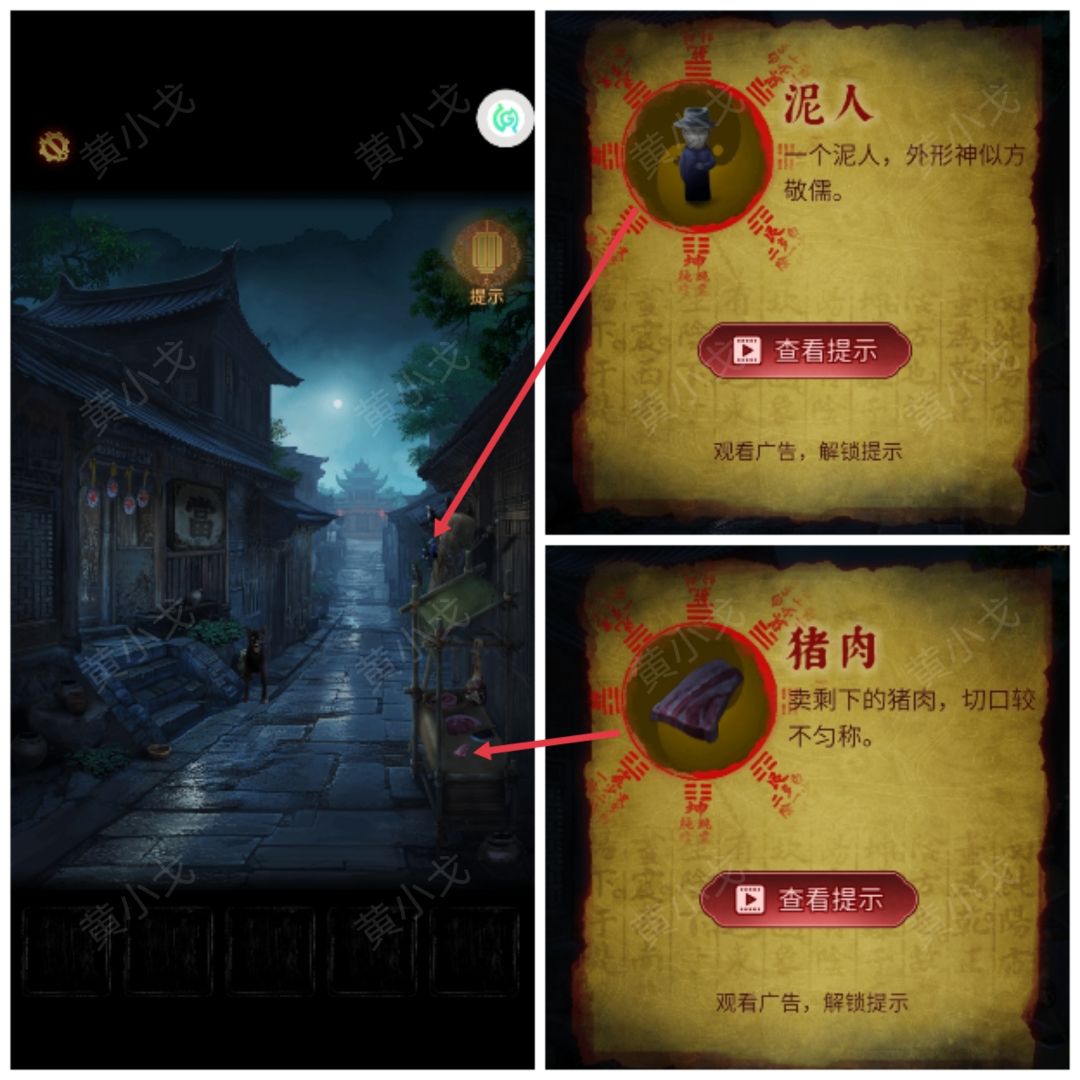 1.(小巷)在猪肉摊上获得【猪肉】,在木头架子上获得【泥人】