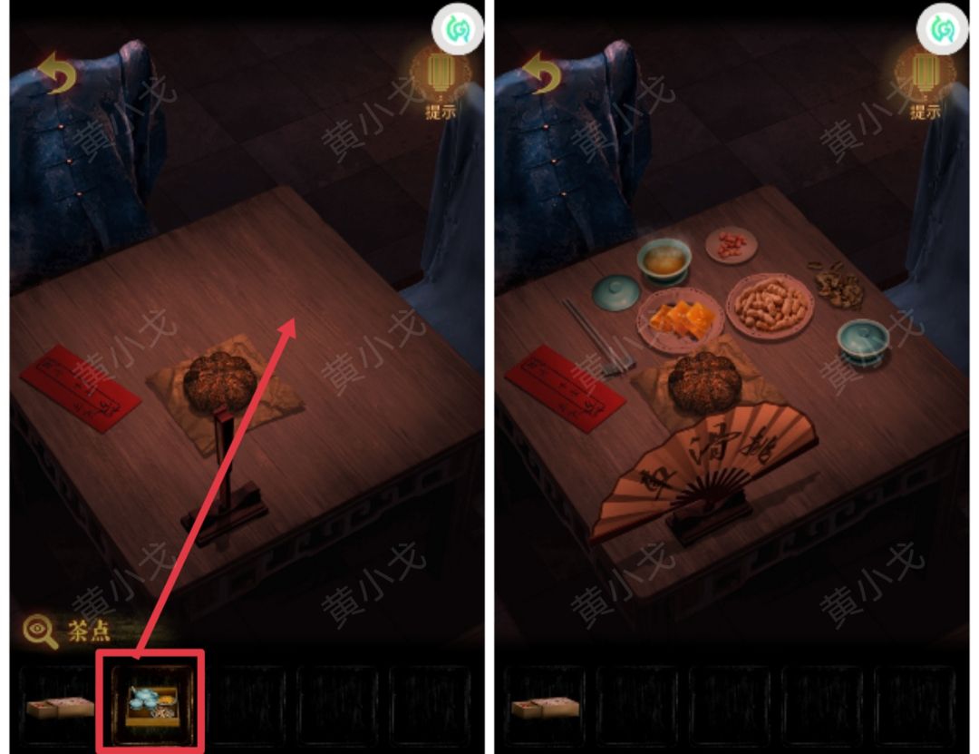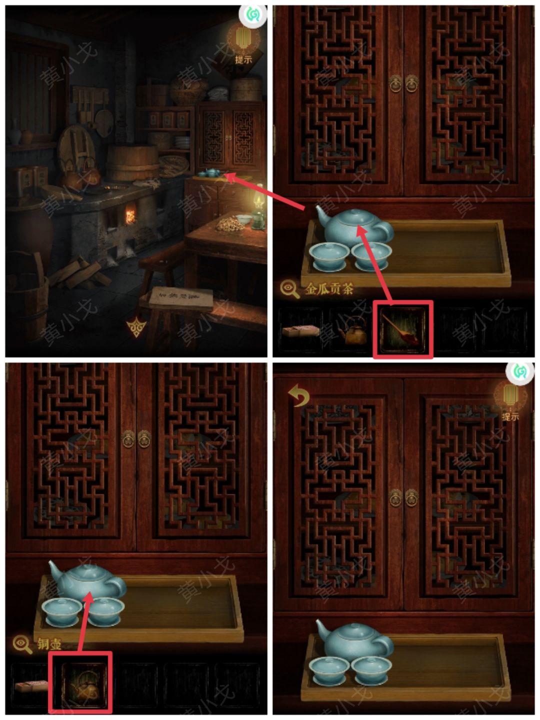 12.(戏楼-厨房)点击柜子上的托盘,把【金瓜贡茶】放入茶壶,再倒入【铜壶】里的水