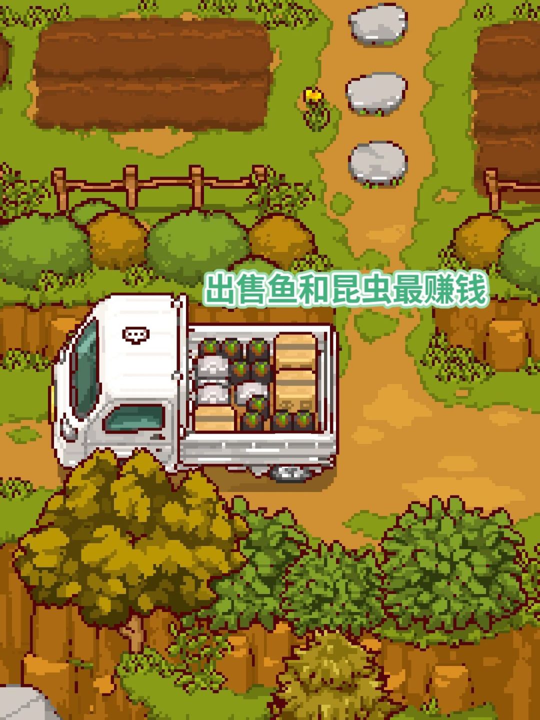 6⃣️:遇到收货大卡车前期先捡花卖,有鱼竿和捕虫网再去卖鱼和昆虫赚钱,木头石头柴火等前期用量大,不要卖。