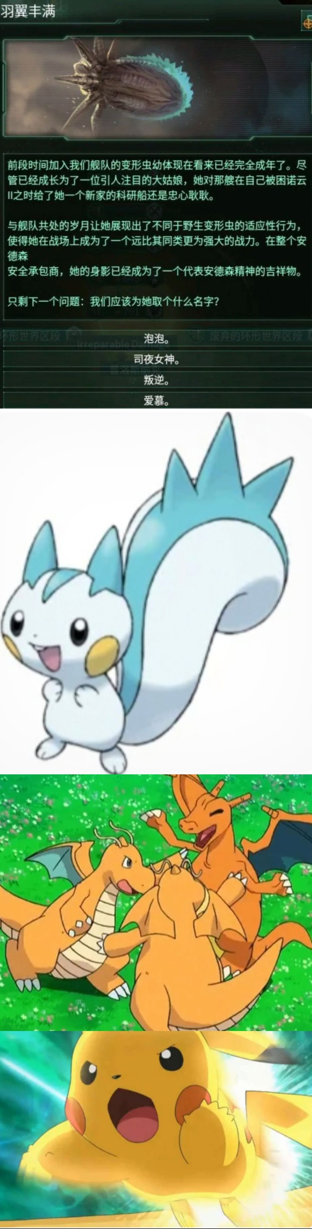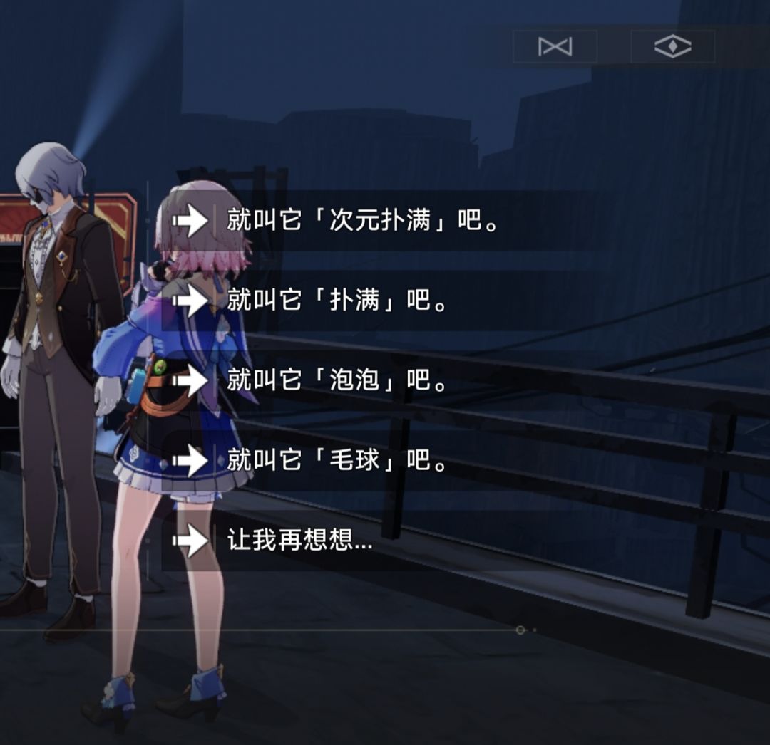 泡泡&毛球——泡泡来源于游戏群星中的一种生物的名字,游戏中有一个迷路的太空变形虫幼体,玩家可为其命名,第一个名字就是叫泡泡,而当玩家选择了太多次这名字不好,换一批的时候,就会出现选项:够了,就叫它"毛球"好了。