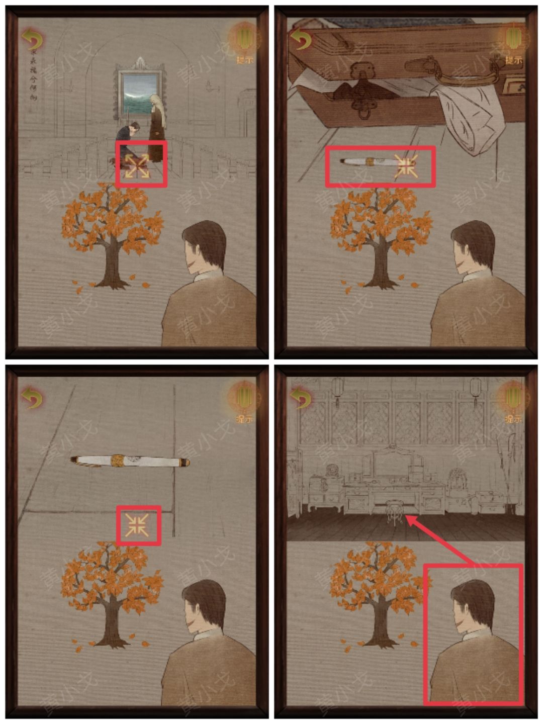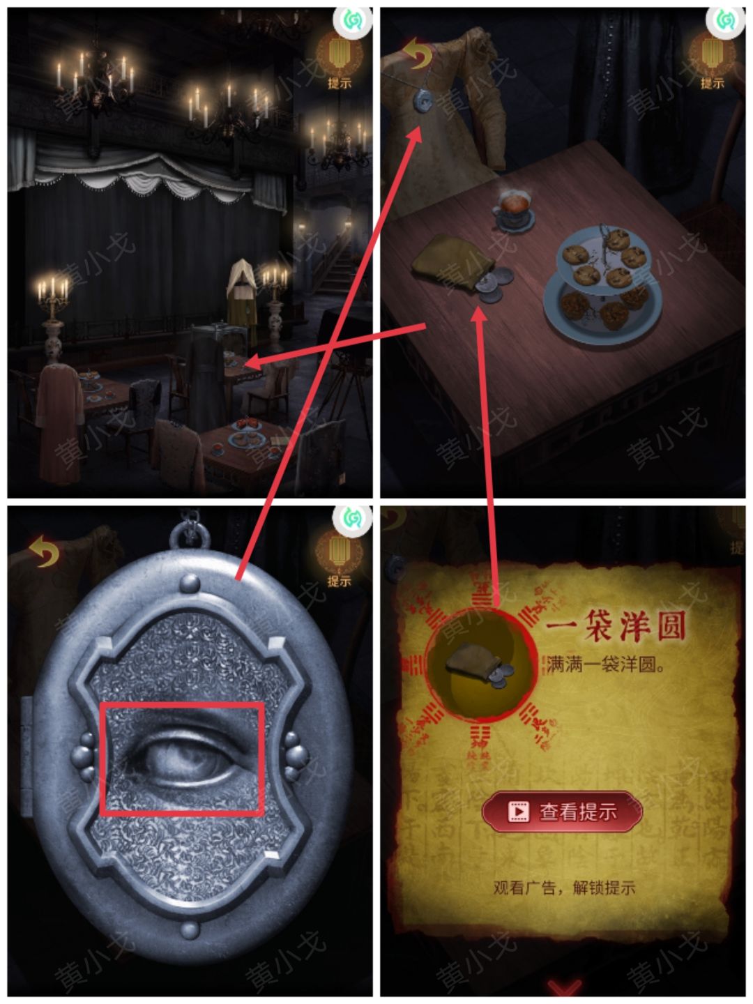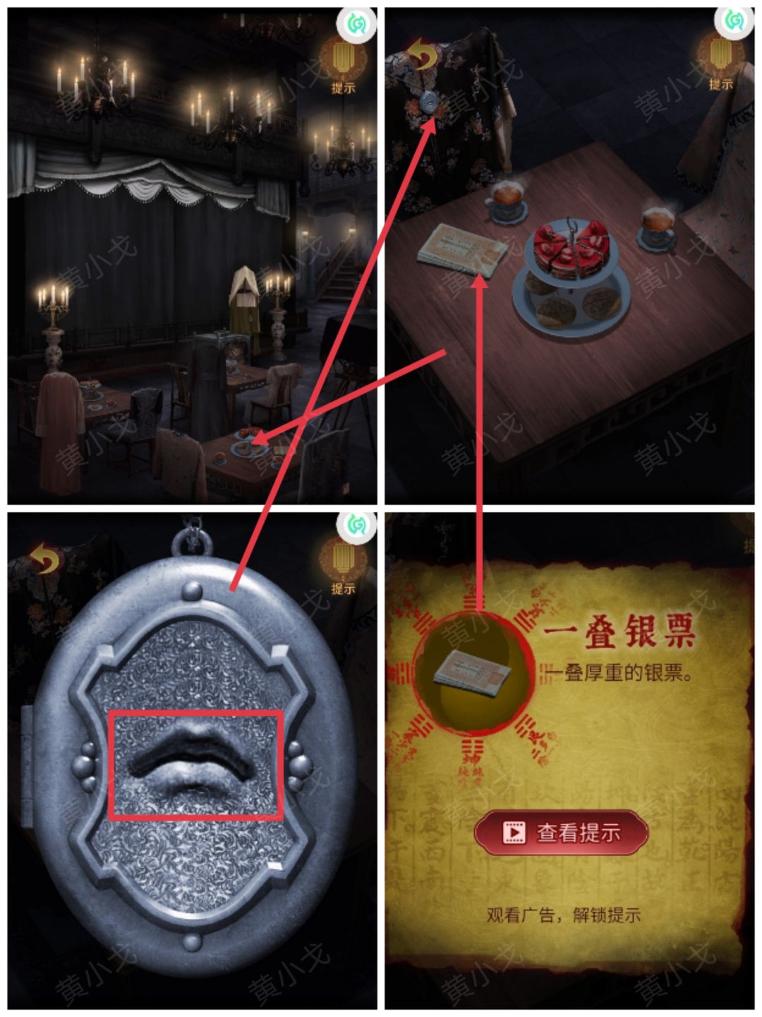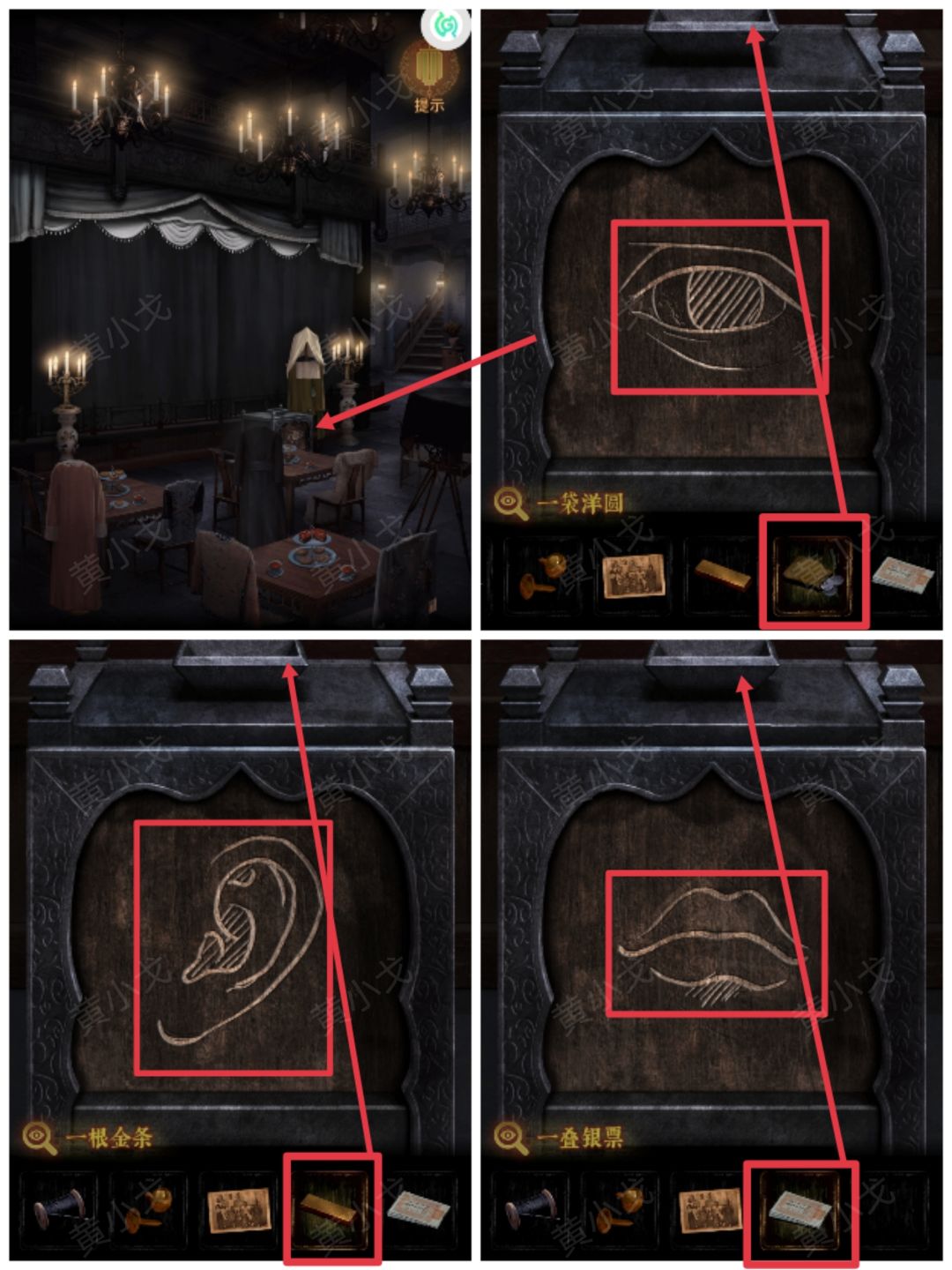 4.点击箱子,根据箱子上的图案,结合三个夫人吊坠上的图案及桌子上的钱,放入【一袋洋圆】、【一根金条】和【一叠银票】
