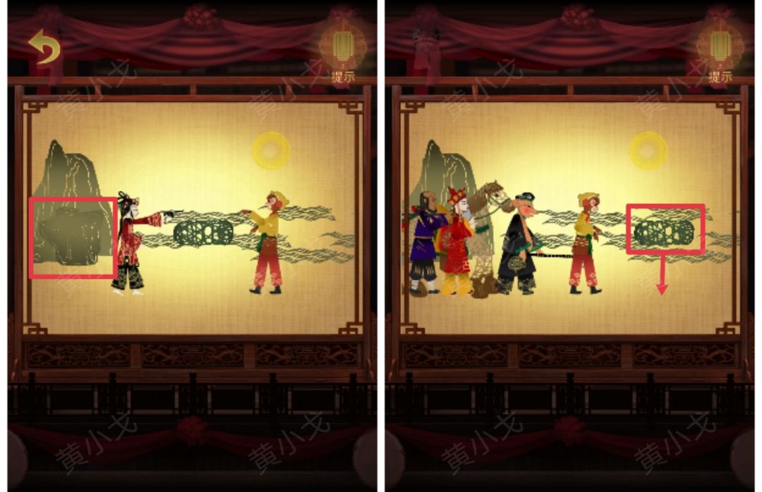 16.点击戏台,拖动堵住山洞的石头,放出猪八戒帮忙;拖动猪笼到陆地,解救荣莲