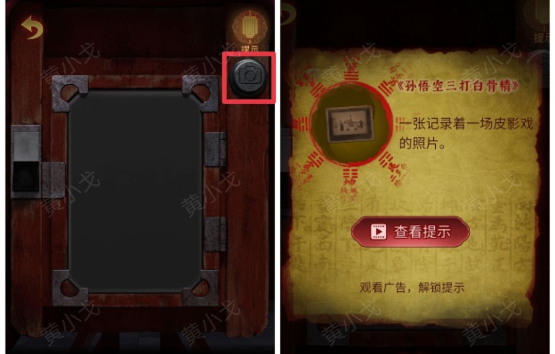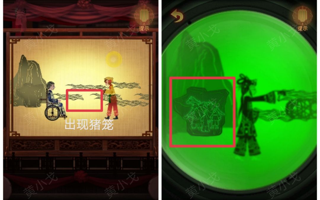 15.点击海水,出现猪笼,方敬儒变妖怪;点击相机,打开开关,点击绿色的镜头,发现唐僧等人被困在山洞里