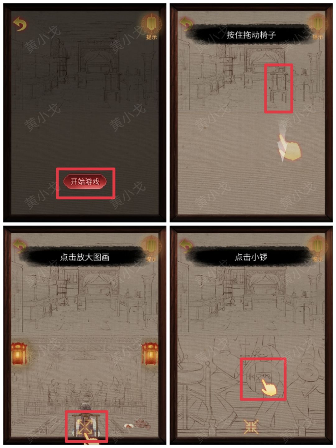 19-1.点击开始游戏→按住拖动椅子到下方场景→点击放大场景→点击小锣