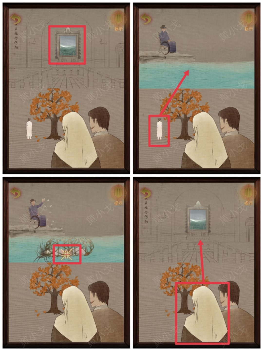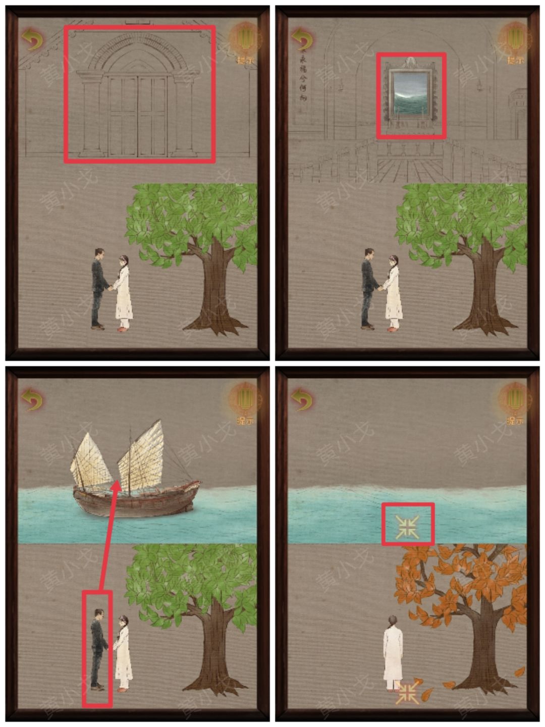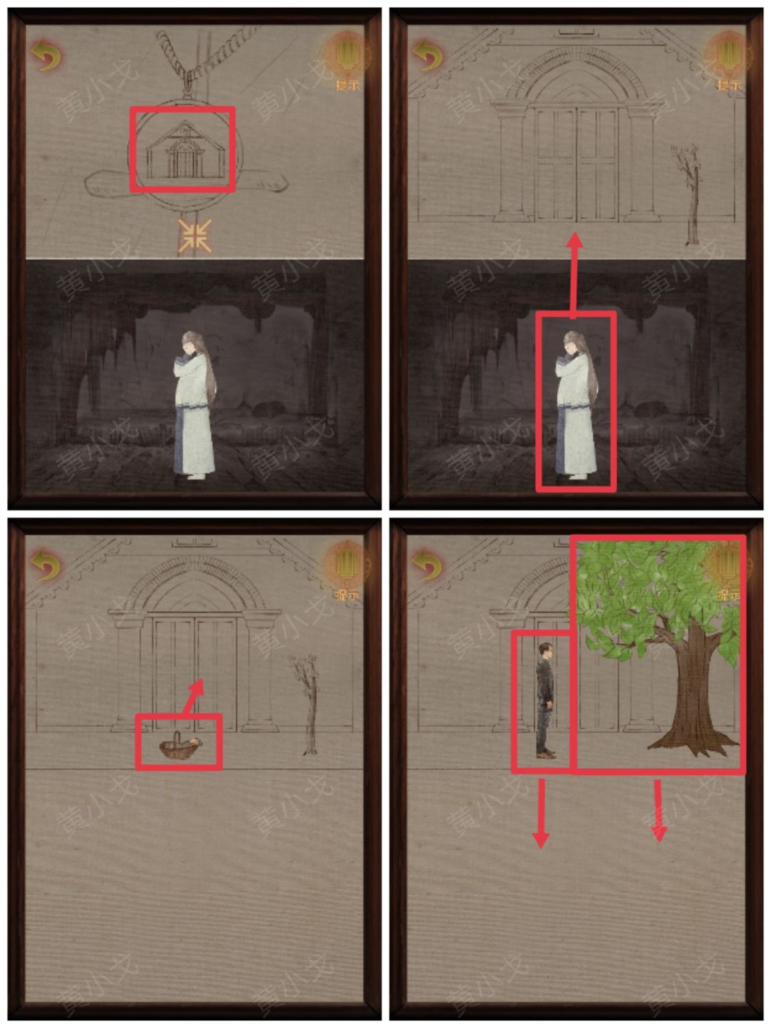 19-3.点击吊坠里的教堂图案→拖动女子到教堂外→拖动孩子到教堂里→拖动男子和树到下方场景
