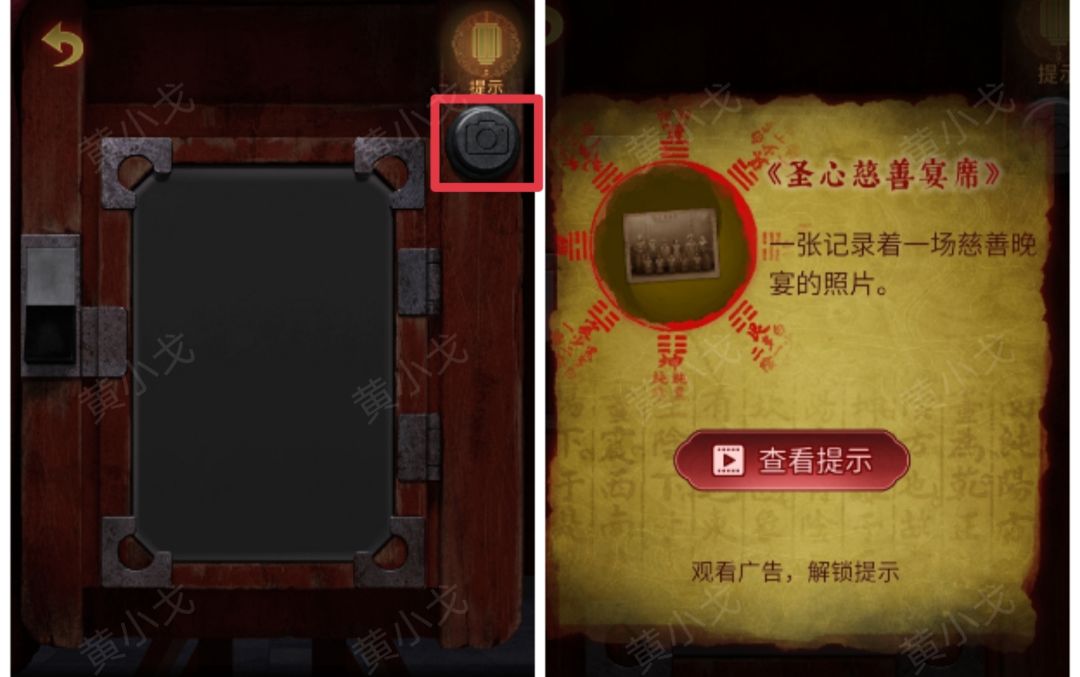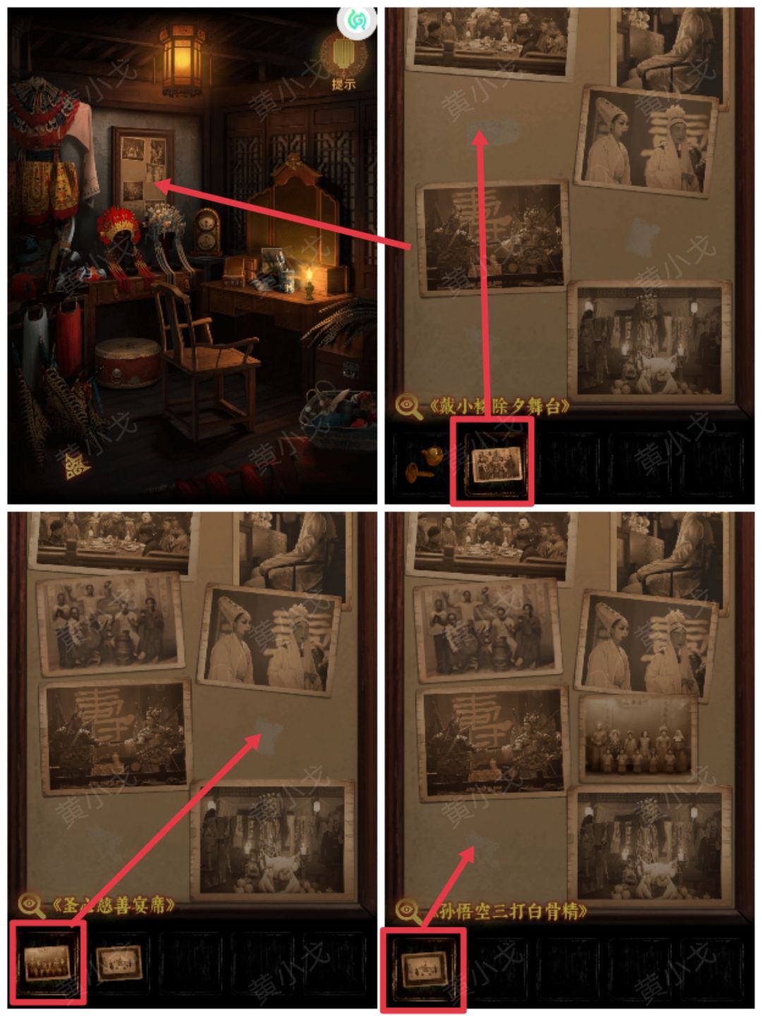 18.(戏楼-后台)点击照片墙,放上【戴小楼除夕舞台】、【圣心慈善宴席】和【孙悟空三打白骨精】