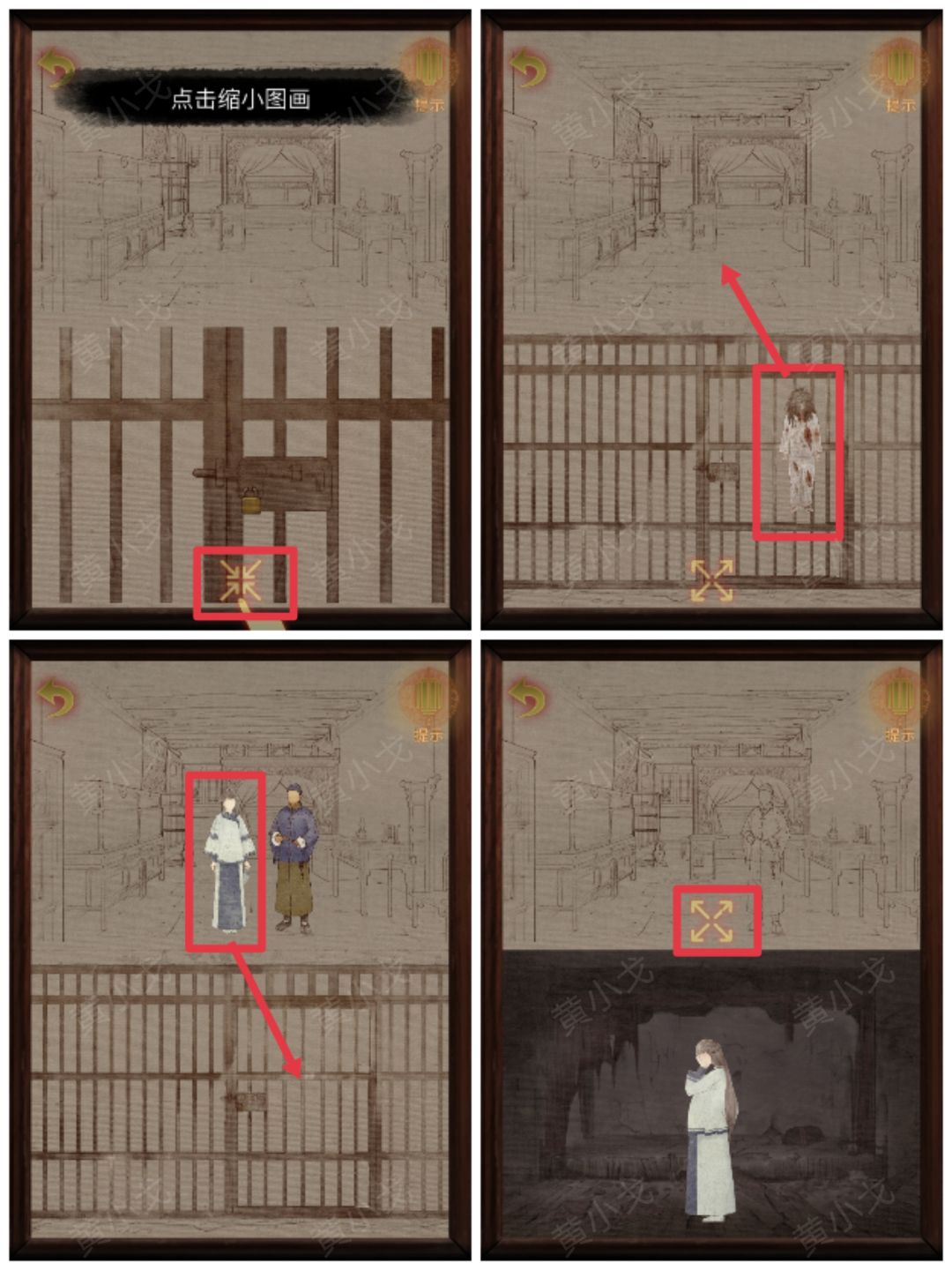 19-2.点击缩小场景→拖动牢房里的人到房间→拖动女子到牢房→点击放大场景