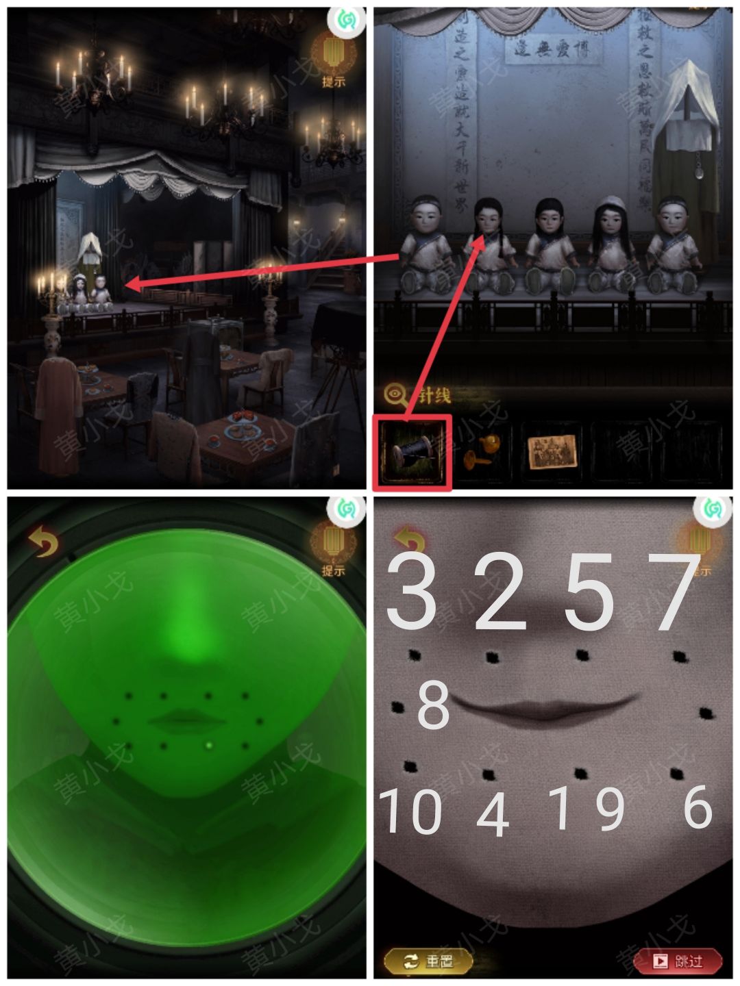 6.对戏台上的第二个娃娃使用【针线】,根据相机里娃娃嘴边小洞亮起的顺序和位置,按顺序点击娃娃嘴边的小洞