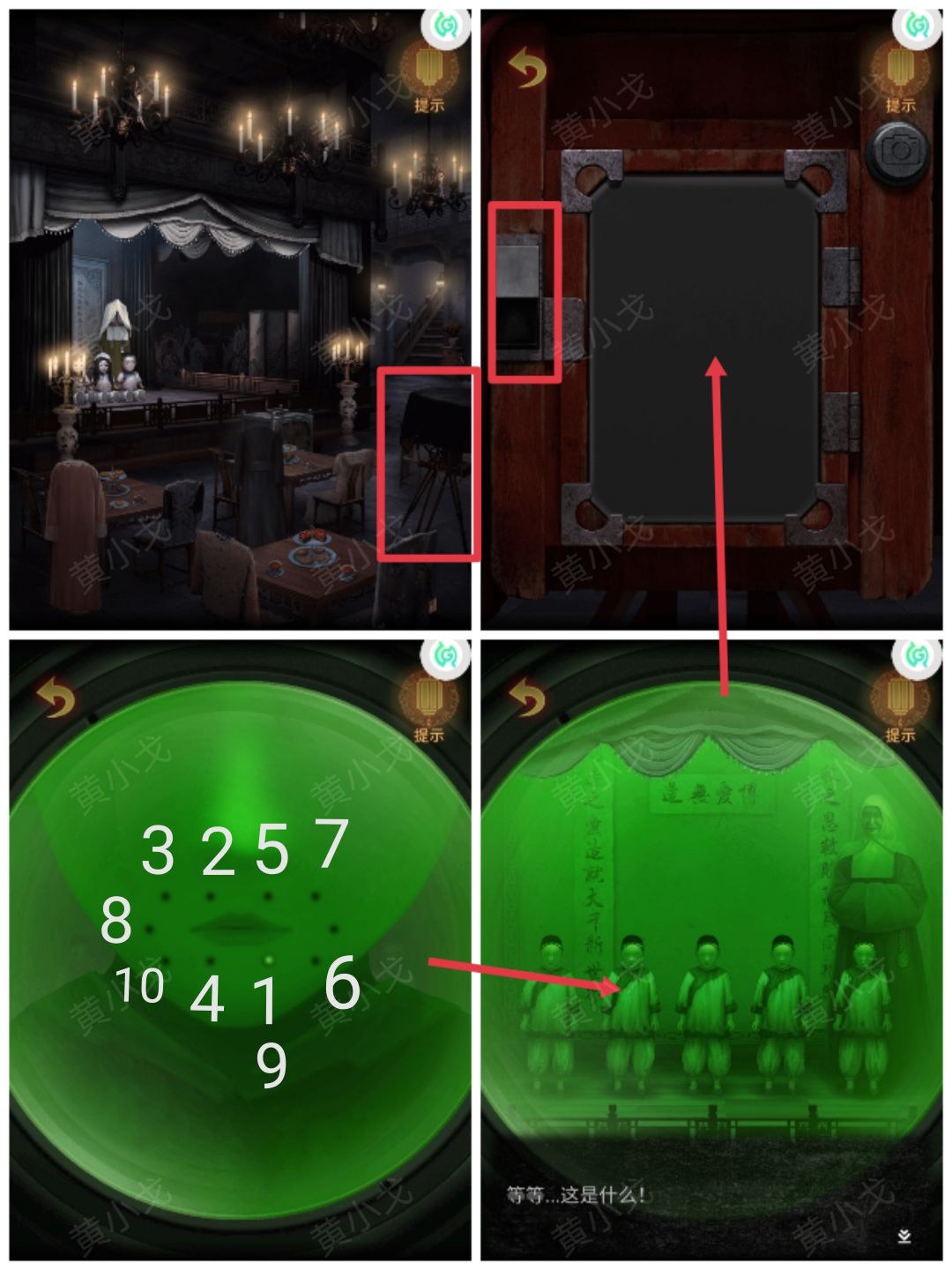 5.点击相机,打开开关,点击绿色的镜头,注意看娃娃嘴边小洞亮起的顺序和位置