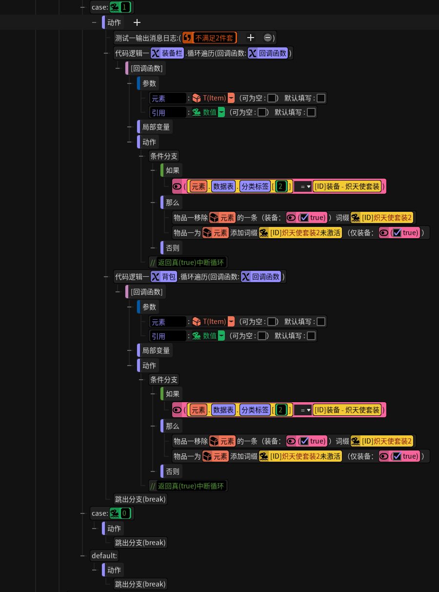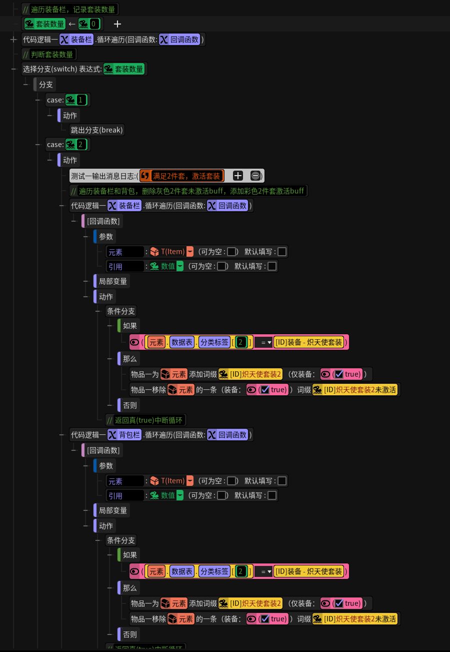 判断套装数量,执行对应的逻辑。这部分应该比较容易理解,物品拾取到背包中,会根据身上的装备数量自动激活对应的套装buff。(