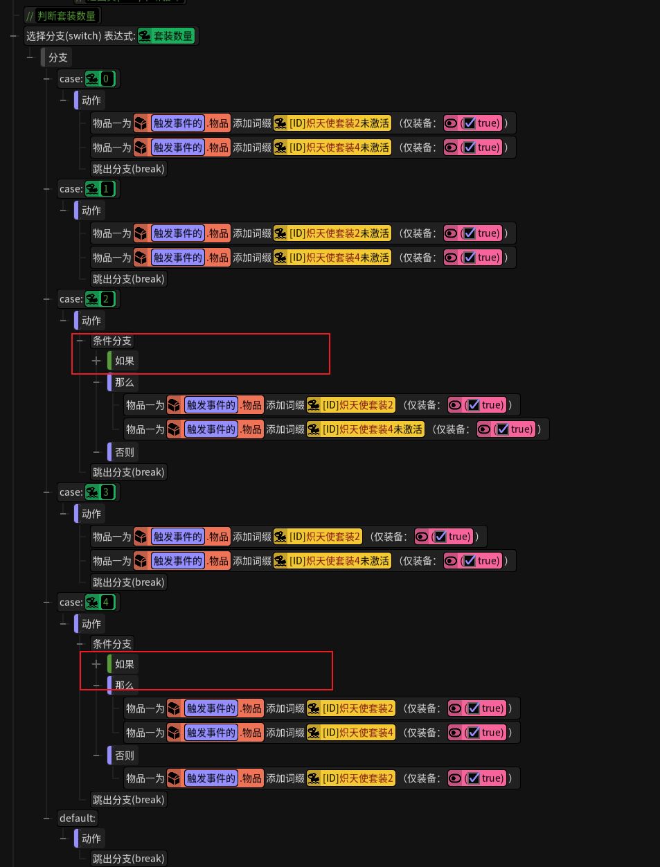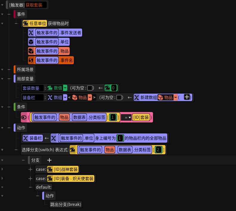 )判断套装数量最好是Switch,因为每个套装数量都要有对应的执行逻辑(详情查看触发器部分)。