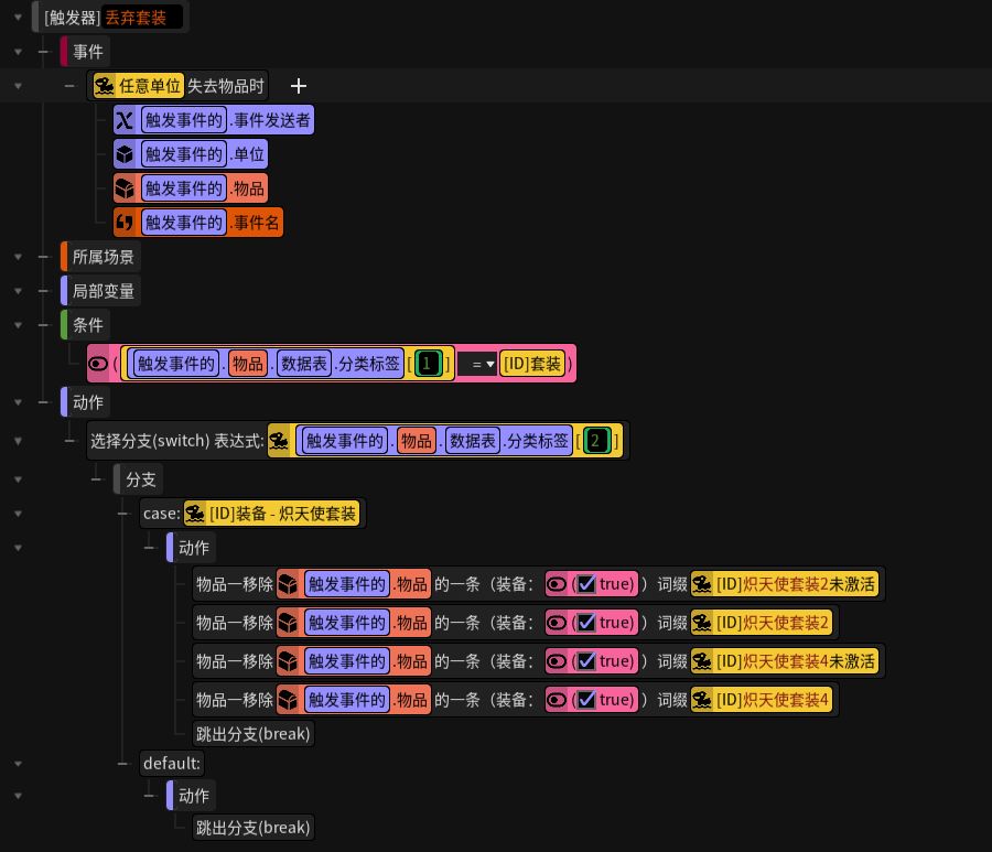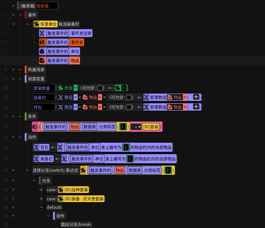 这一点理解了,那么之前的问题答案就显而易见了,穿脱装备写成2个触发事件单独触发。(一个触发事件也可以,大佬随意
