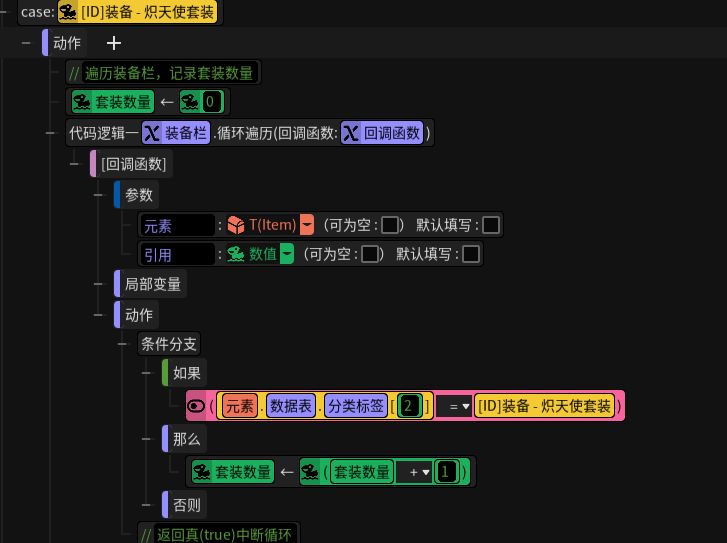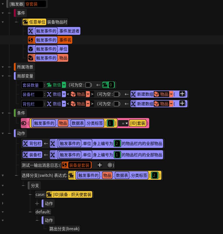 遍历装备栏,获取装备的套装数量与获取物品触发器中的写法一致,不再展开。
