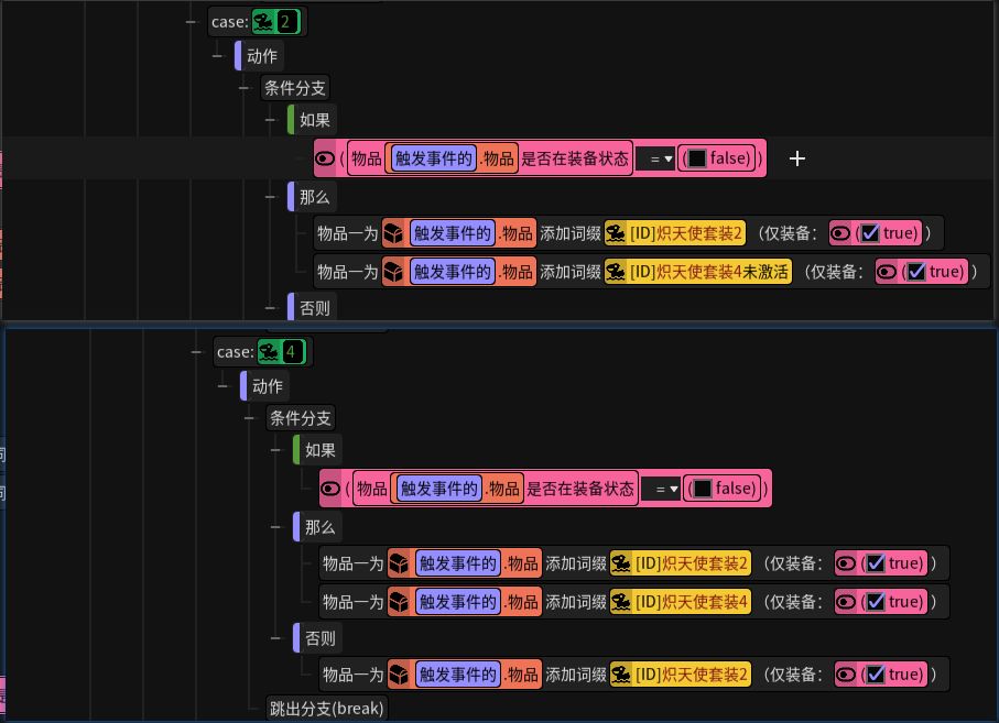 ?也很简单,只要在获取触发的时候加个条件限制,在添加激活buff的时候判断下物品是否装备,如果装备了就不添加buff,没有装备才添加buff。另外4件套效果如果装备了还要额外给套装加上2件套激活buff,因为穿装备的触发中只会添加4件套激活buff。