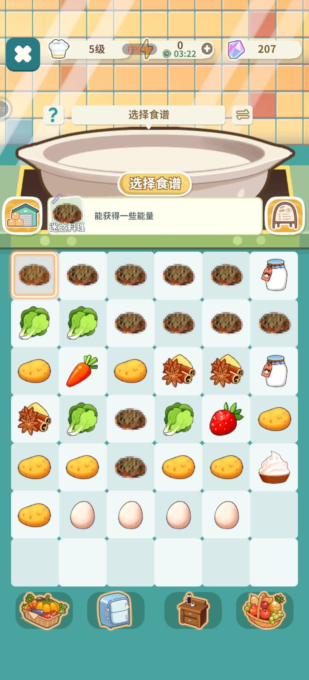 送礼会消耗食物,食物可以在左下角厨房烹饪获得,购买烹饪食材则需要用到能量,这里我们可以选择食谱香肠,随意放上两个基础的一级材料烹饪,即可获得迷之料理,使用后获得31点能量,就此可以无限循环能量永远不缺,食谱的话我只做最基础的,薯条、云朵蛋、馒头,有租客满意度低不用看需求,直接礼物堆满即可。