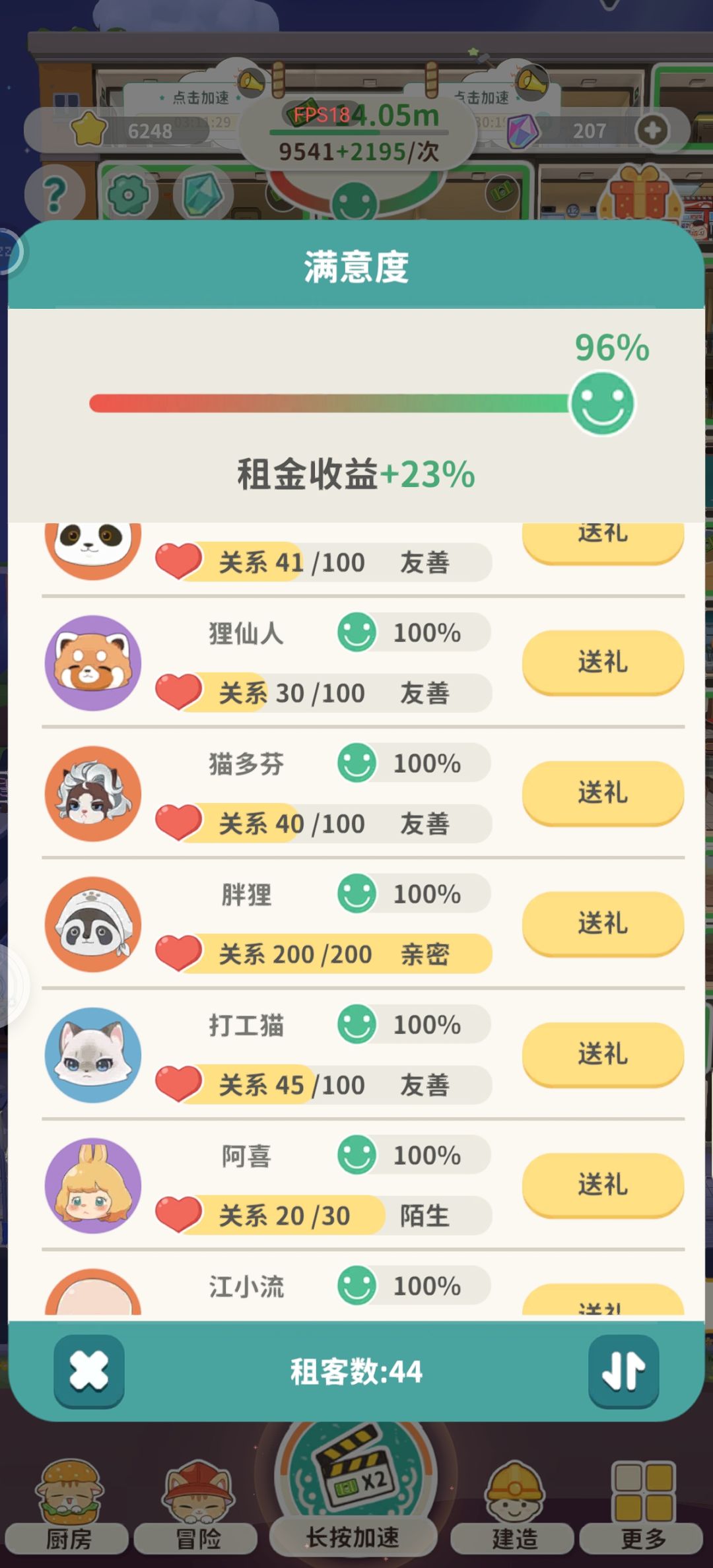 玩了两天目前13层,给新手个建议,这游戏是不缺租金收益的,缺的是幸福能量,后面解锁所有建筑都需要用到,而且获得渠道单一,目前只有给租客送礼和租客关系事件会获得。