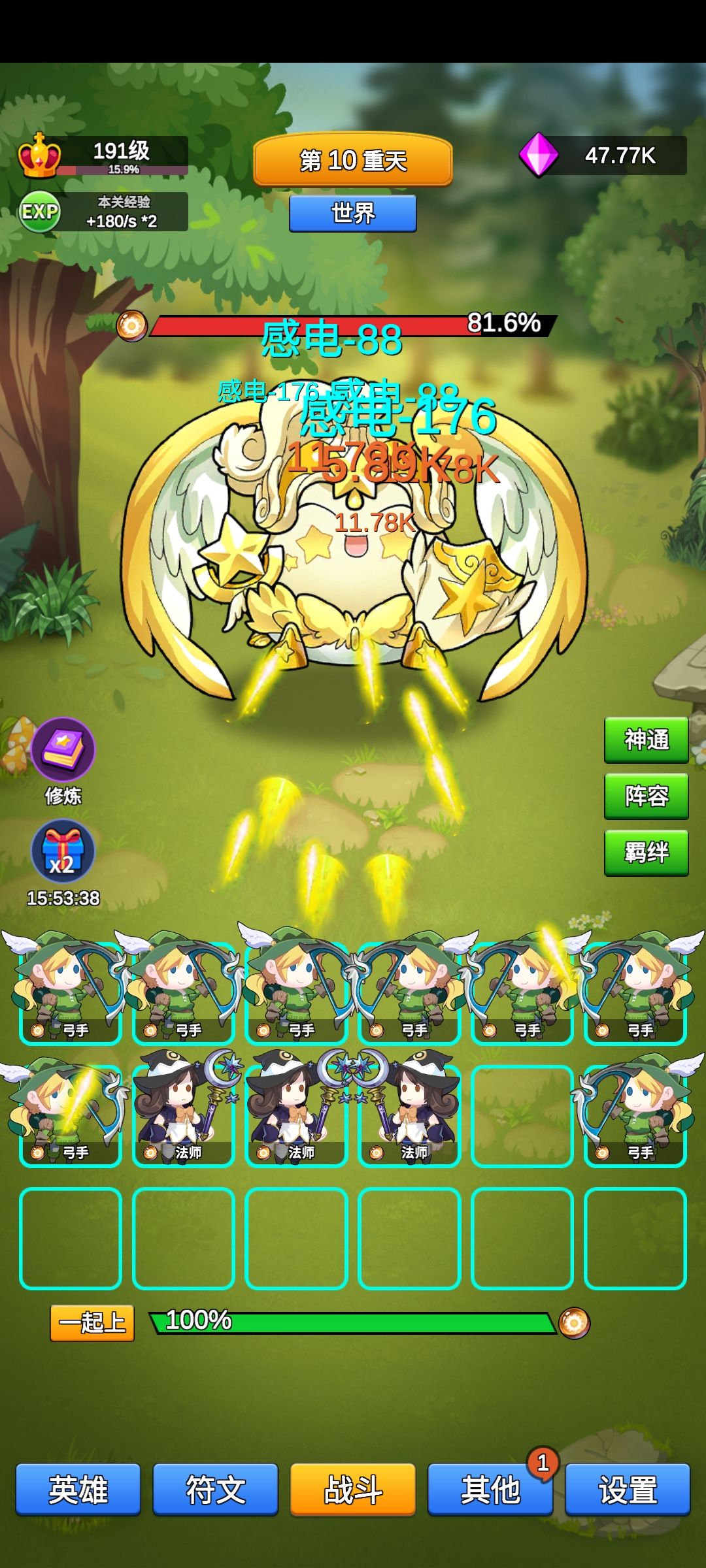 光弓配光法,一直感电,一下子就打完boss了,这游戏纯挂机爽游,太合适上班摸鱼了,广告看一免二,偶尔看一下就行,纯单机游戏,看自己追求进度,很适合打发碎片时间