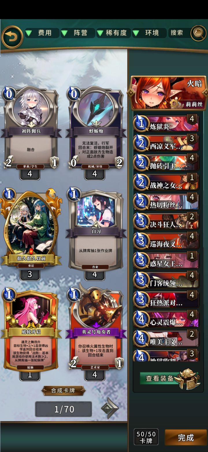 这是莉莉丝“狂暴”卡组,对局很快,十回合内赢不了,这把就很难赢了。运气好可以2费铺满全场。开局留“抛砖引玉”和其他带有“狂暴”词条的卡牌。把对手生命线降到13血,用狂热派对➕生物牌,只要对方没回血,大概率就赢了,伤害不够,下回合放直伤。卡组讲究运气。不小心2费把本体丟出去没有回来,心态要放好