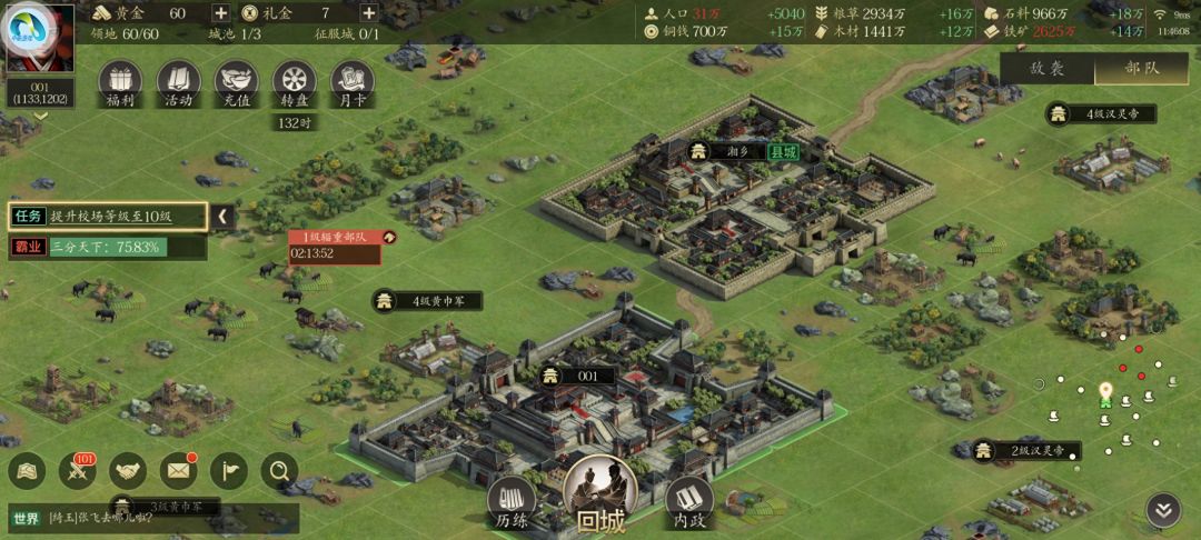 想要升级高级别的分城,首先我们需要一个建筑满级的一格分城。有三种办法:第一直接自建全一级新城开始键(不推荐);第二去野外占领10级普通城开始建设,运气好里面也可能建筑全10级,占领后只需要升级外城的资源建筑;第三去野地占领有名将驻守过的城池(名字叫黄巾军LV10或者汉灵帝LV10),占领这种城池,运气好的话外城建筑是30级的(推荐)。