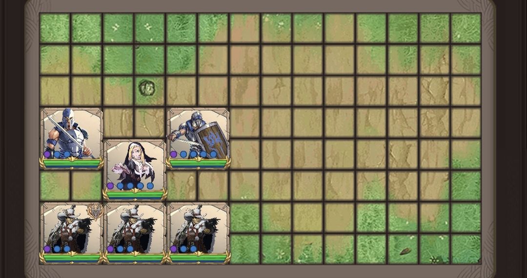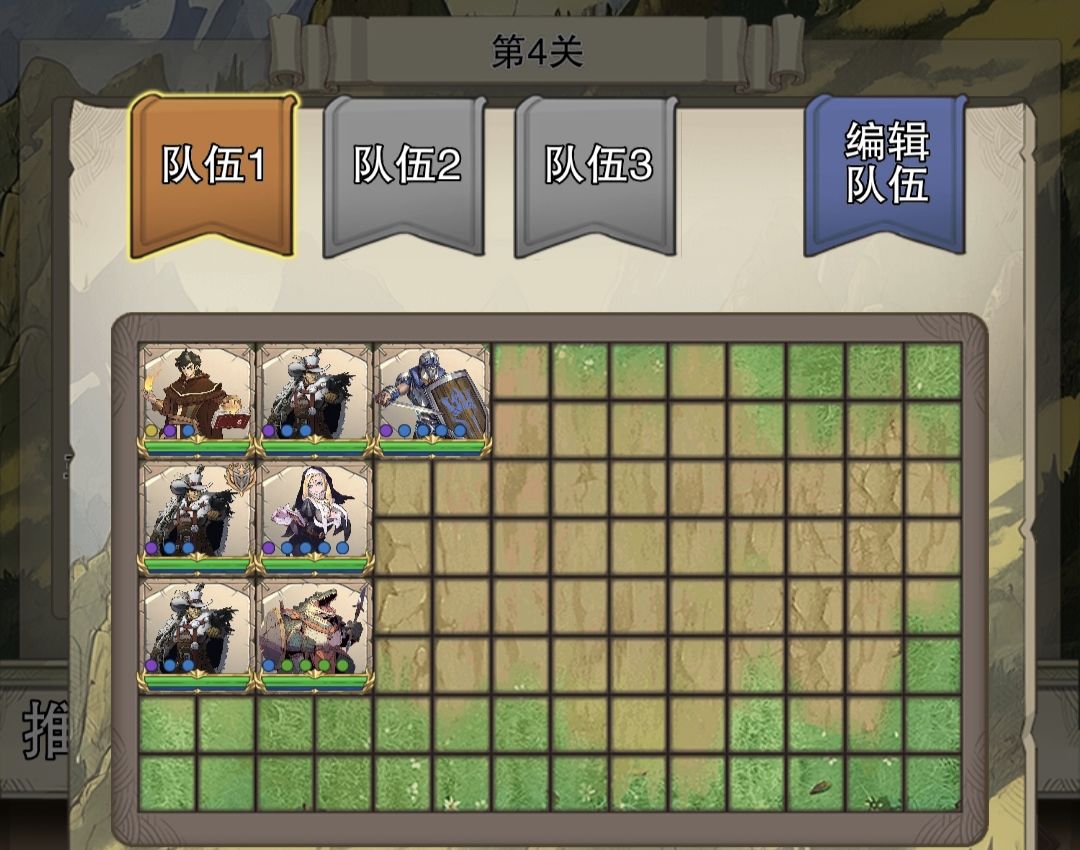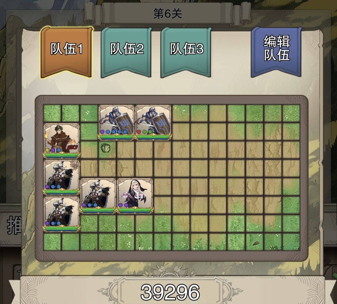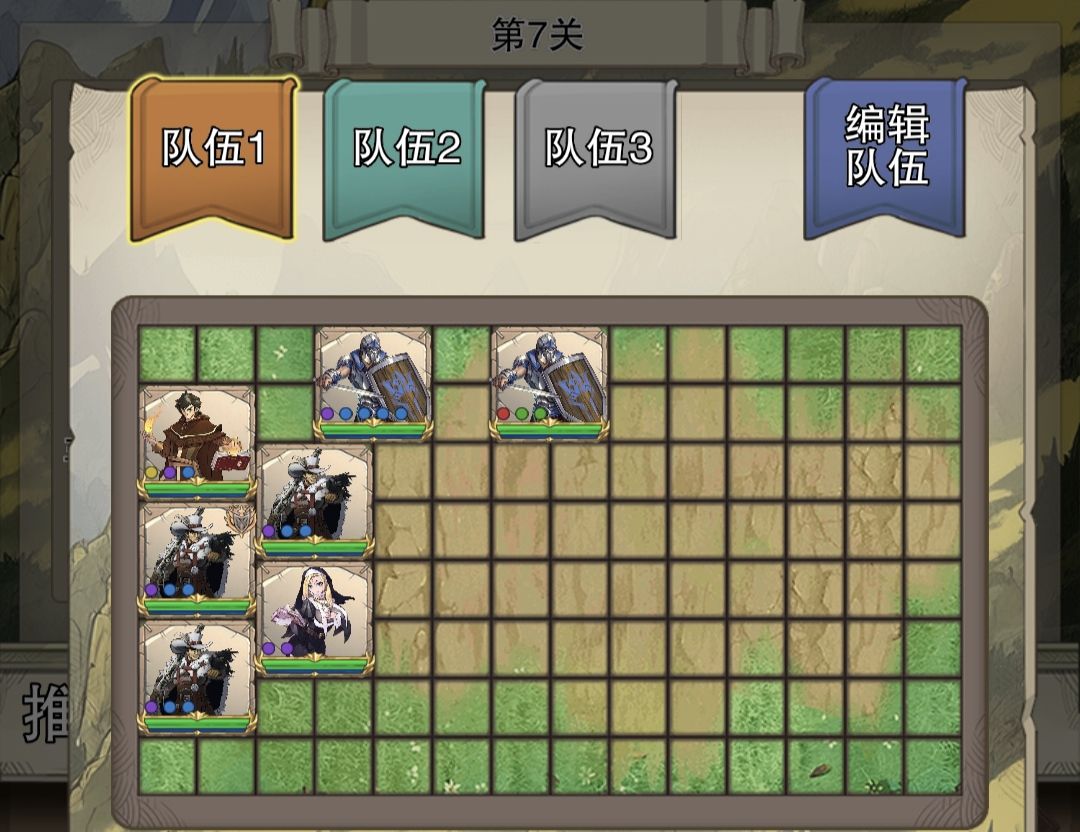 前面几关延续之前的阵容打法,一路扫图,到第6关,前排压力大了,将后排盾挪前面来。(如下图)