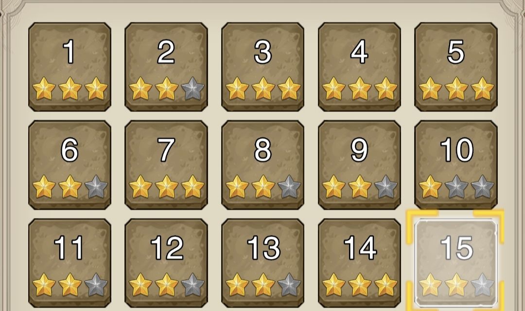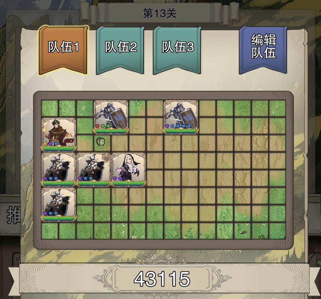 继续使用如上阵容扫图,到第13关再将两盾间隔拉开一格。(对面为大体型,拉开间距能挡住更多的敌人),并且升级两盾+火法+战意魔枪到39级,升级剩下的英雄到20+级(需要提高输出,否则会因为输出不够,打不出三星)