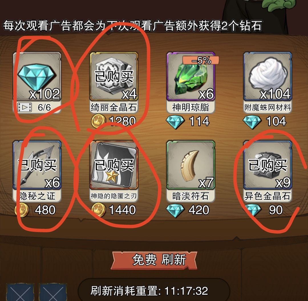 商店里主要把每日钻石6次领了(需要免广告和钻石双倍的这时候要先加群找管理),然后买金币的材料道具,最后大概估一下自己的钻石储量,可以适当钻石购买进阶道具。(标注如下:)