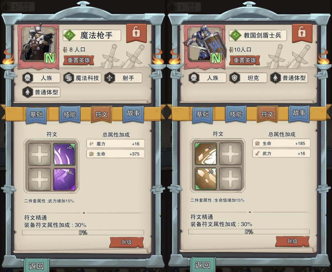 由于开了商店可以,看看脸能不能和关卡掉落的符文搭配,组半套加成。如下,是我凑的两个半套,肉给剑盾,武力给魔枪,魔力给火法,有暴击的话也给火法。可以看到虽然低级符文直接加成不咋地,但是半套加成是百分比加成,进场之后属性提升还是很明显的(符文套装加成要进入战斗界面才加上)。