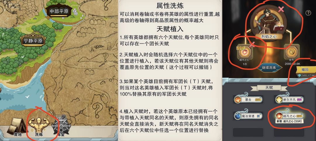 洗练在大地图界面下方第二个进入。洗练规则,分属性洗练和天赋洗练,具体规则看下图,总结天赋洗练关键点就是,每次打天赋位置随机,有同名天赋的先随机打在某个位置,然后再去掉原同名天赋。打天赋先选定英雄,再选要注入的天赋球道具,祝大家都一发入魂,如果这次注入顶掉了原本重要的天赋(比如火男的暴击),那点击右侧的撤回,保留原天赋状态,天赋球不返还,另外需要消耗500钻(论存钻的必要性)。