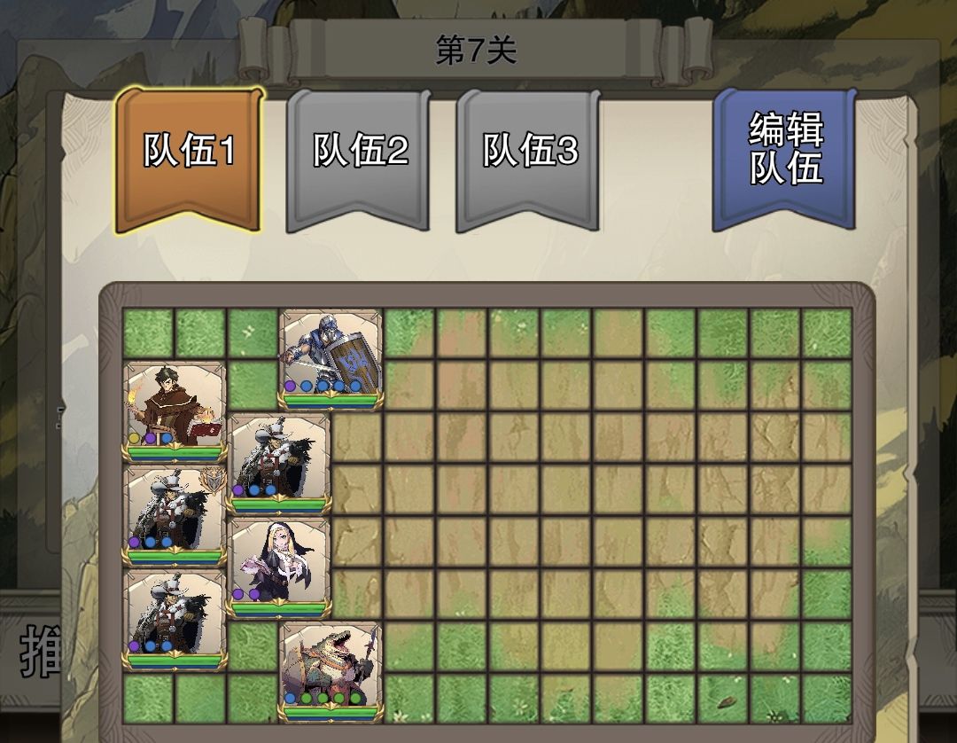 接下来给火男、战意魔枪、剑盾、鳄鱼升20级以上,其他10级,然后继续推图,第7关如上调整下站位,就可以继续打,直到小径通关。