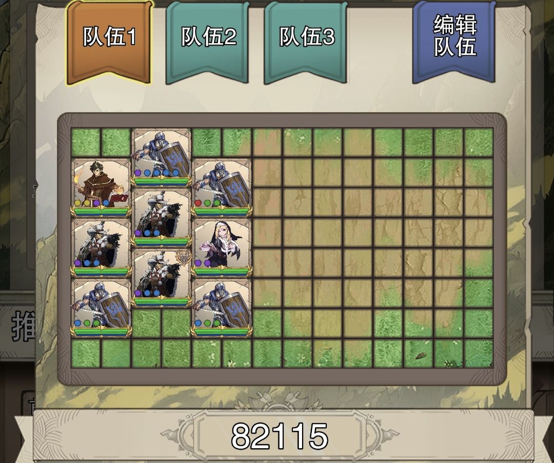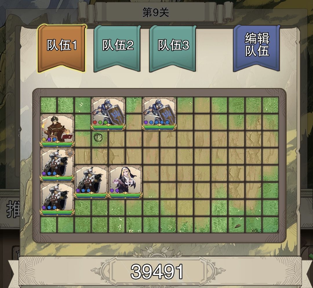过了6关后变回原阵容继续推图。直到第9关,再次变成前排两盾,并且拉开一格间距。(如下图)