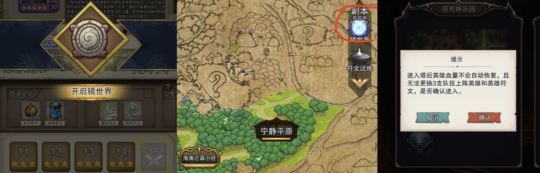 过了第14关,就开启镜世界了。镜世界在大地图右侧作为副本进入,注意镜世界一次可进三队,但选定地图进入后,队伍锁定,只能修改阵型,不能替换英雄,且镜世界内战斗结束不会自动恢复满血。所以建议,先不急进入,先推图推到卡关,将实力提升到当前极致,再进入镜世界,由于初期角色基本不带吸血,所以建议带奶妈进图保证续航。